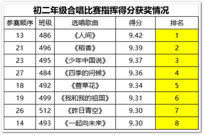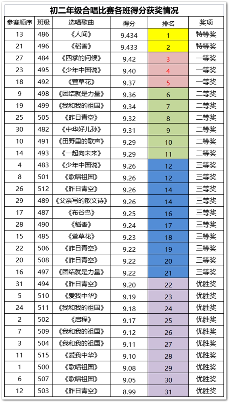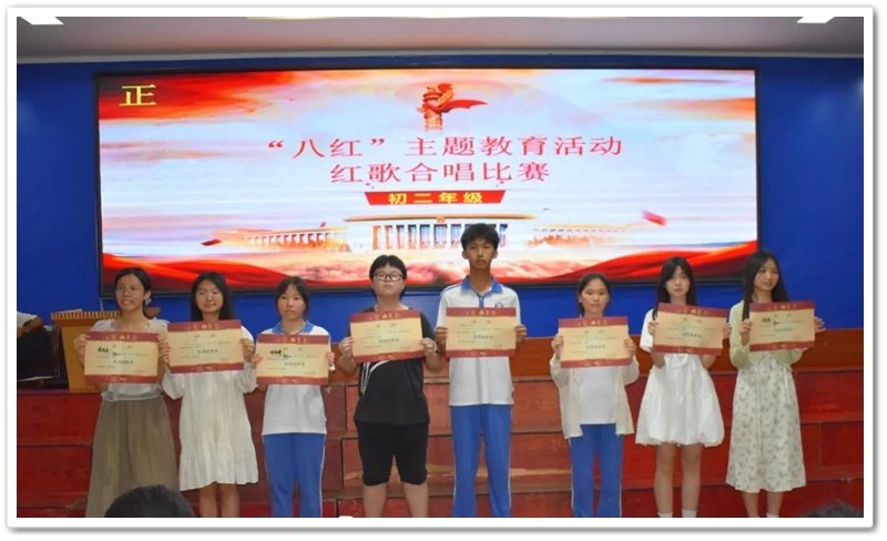 本次活动分为两个会场,力争全年级31个班班班参与,人人会唱。活动本着公平公正的原则,旨在激发学生学习红色文化的热情,设立了必选曲目和自选曲目两首演唱歌曲。特邀请十位科任老师担任本次比赛的评委,从表演内容、表现力和完整性、指挥以及舞台创意四个方面展开评分,比赛最终得分由高至低依次评选出特等奖一名,一等奖3名,二等奖6名,三等奖10名,优胜奖11名,以及优秀指挥奖8名。
