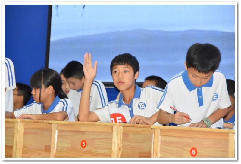 台上比赛正式开始。第一部分是“诸侯会盟”笔试,即二十位选手同时参与答题,选出五位准擂主。由记分员一人同时给两名选手打分。共十题,每题两分,有错别字的扣一分。每完成一题之后,选手看着正确答案,举手示意“答对”,这让本班观赛同学欢欣鼓舞,掌声一阵接着一阵。遇到简单的题,若不是早已与主持人老师约法三章,跃跃欲试的观赛同学恐怕早已将他们知晓的答案脱口而出。主持人老师趁着十位记分员将计分表交给钟赛儿老师进行排名之际,准备了十个简答题现场互动,观赛学生个个答得声音洪亮,气势冲天,意犹未尽。