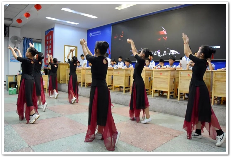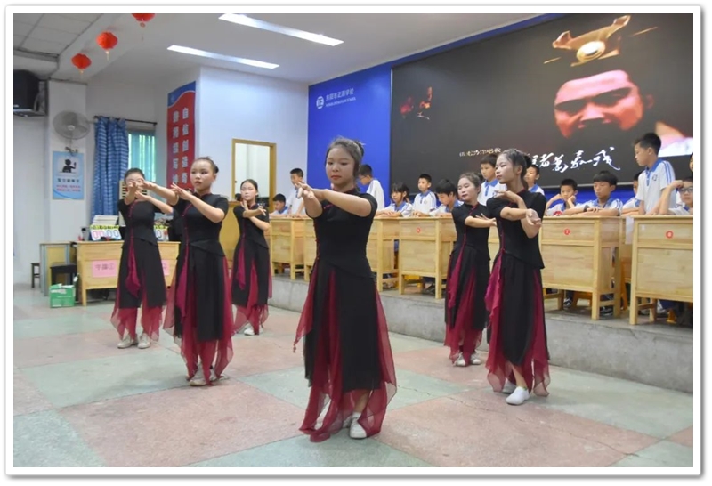 本场《三国演义》知识竞赛的开场舞是美女老师王睿指导的,由来自五年级355班、357班、359班的八位舞蹈小演员表演《三国恋》古典舞。柔美蹁跹的舞姿结合女生版唱腔,为三国金戈铁马的氛围注入了无尽的柔情与眷恋。
