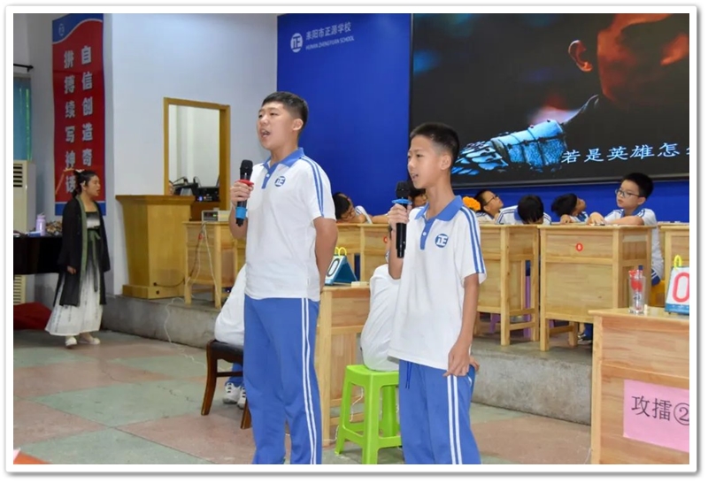 台上第二部分“煮酒论英雄”是倒打擂台赛,共四轮。第一轮由来自360班的王嘉轩(第四名)和来自363班的徐志浩(第五名)进行打擂,第三名、第二名、第一名再依次作为攻擂者向上一轮胜出者发起挑战。本部分共分四个环节:第一环节是必答题,第二环节是抢答题,第三环节是猜猜猜(即猜出题选段来自《三国演义》哪个章回),第四环节是飞花令。其中,两个谋士团可参与的是必答题和猜猜猜。而抢答题因为设计了两个答题点,若抢答到的准擂主答不全,可由对手进行补充,对手可以分走一半的分数。