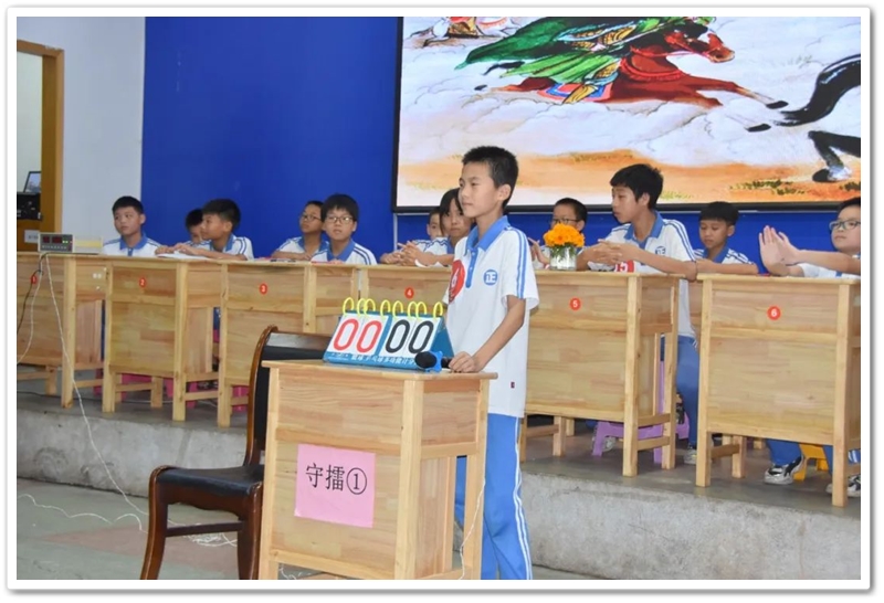 “煮酒论英雄”部分让人惊讶的是:来自360班的王嘉轩第一轮就上台了,却一直以“守擂者”的身份战到了最后!这与以往“攻擂容易守擂难”的场面形成了鲜明的对比。擂台赛期间,主持人老师一再检查攻擂台抢答器,发现毫无异常。年级主任为确保公平,甚至最后改变了抢答的时间点,给予攻擂者充分的思考时间,攻擂者的谋士“助攻团”也一再发力助攻,守擂者王嘉轩竟然岿然不动!