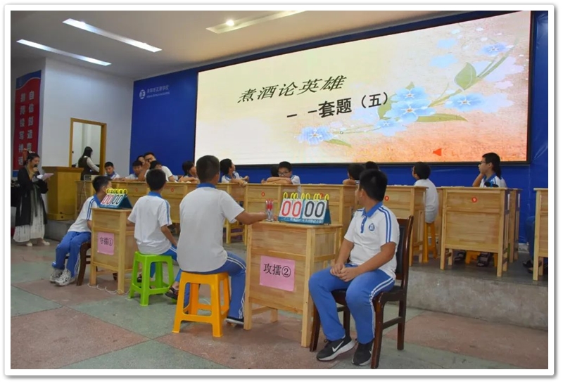 开场舞小演员们徐徐退下后,由五月份台下初赛选拔出来的二十位选手与来自357班的十位小记分员一起就位。今年的赛前互动模式成了五一流行的“挖呀挖”改编版,即三国结课操。由一号选手带领351班观赛同学开始:“我在三国的花园里挖呀挖呀,种名著的种子,吃英雄的瓜……”其后十九位选手接着带领所在的班级边念边做,分享了本学期学习涉及的16个经典《三国演义》人物。新颖的互动形式,激发了学生观赛的热情,也给了选手莫大的支持和鼓励!