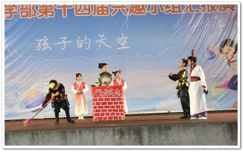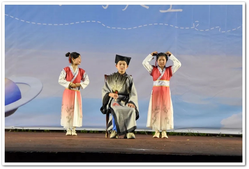 “南阳诸葛亮,如坐中军帐,摆下八卦阵,专捉飞来将。”五年级几位同学扮作诸葛亮、司马懿、司马昭、侍从,字正腔圆的台词、走心的表演,将一出《空城计》演绎得惟妙惟肖,引得台下学生掌声笑声阵阵。