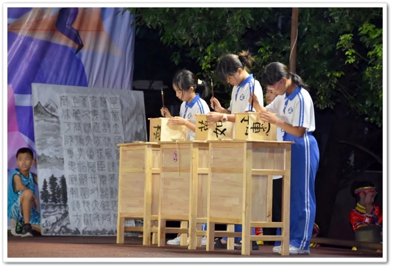 书法节目《泰山石刻》,学生从书法、表演等多方面展现,在灯笼上进行书法展示,别有一番风味。