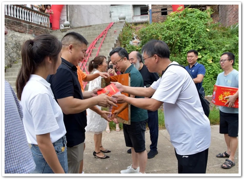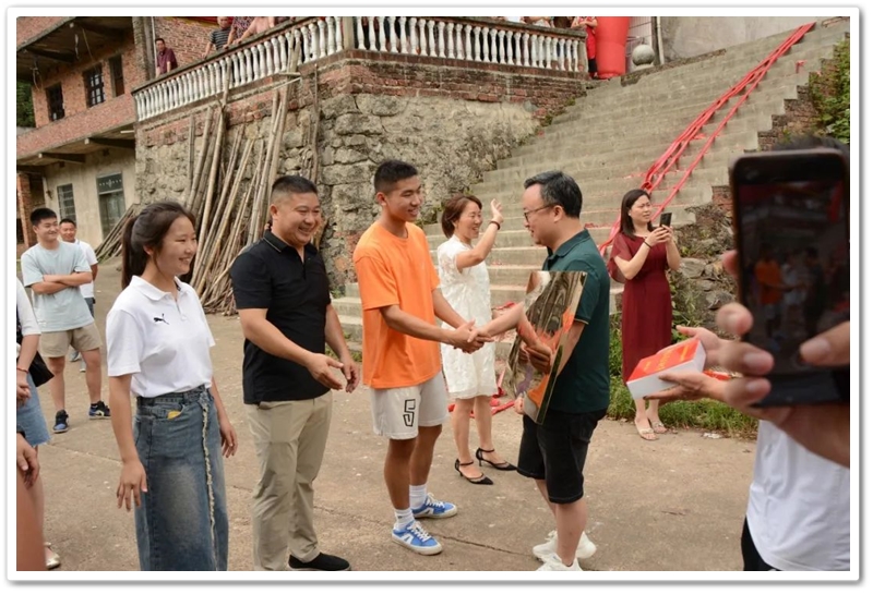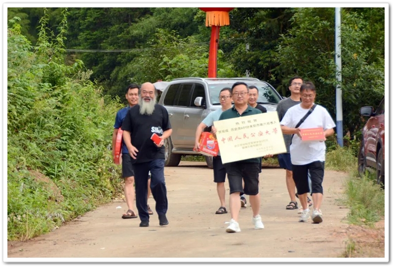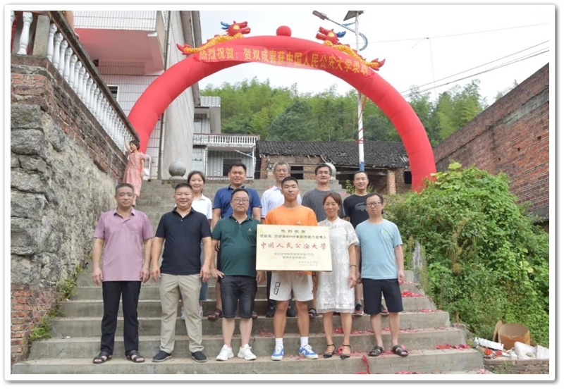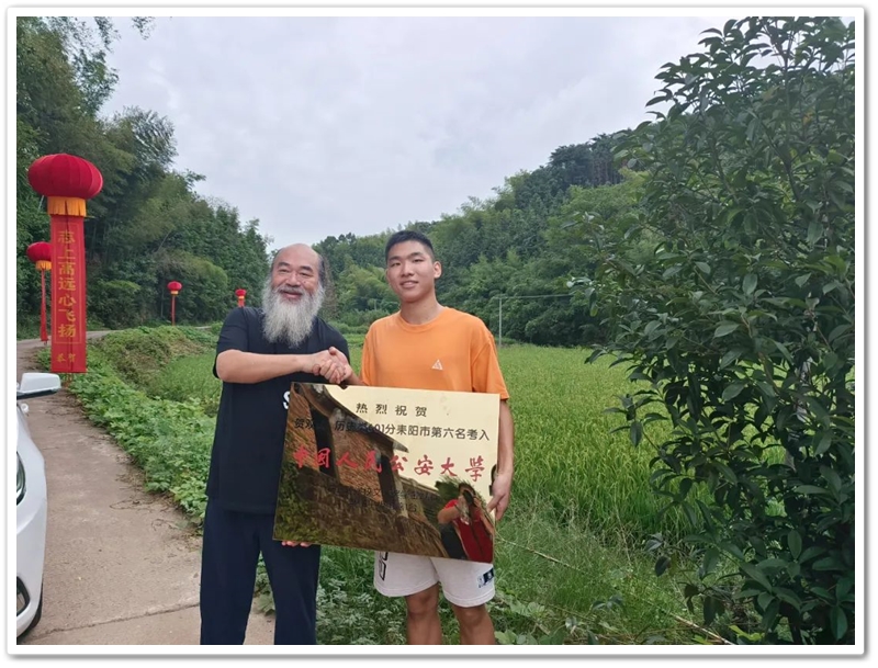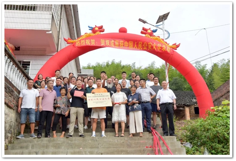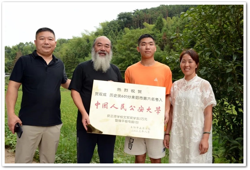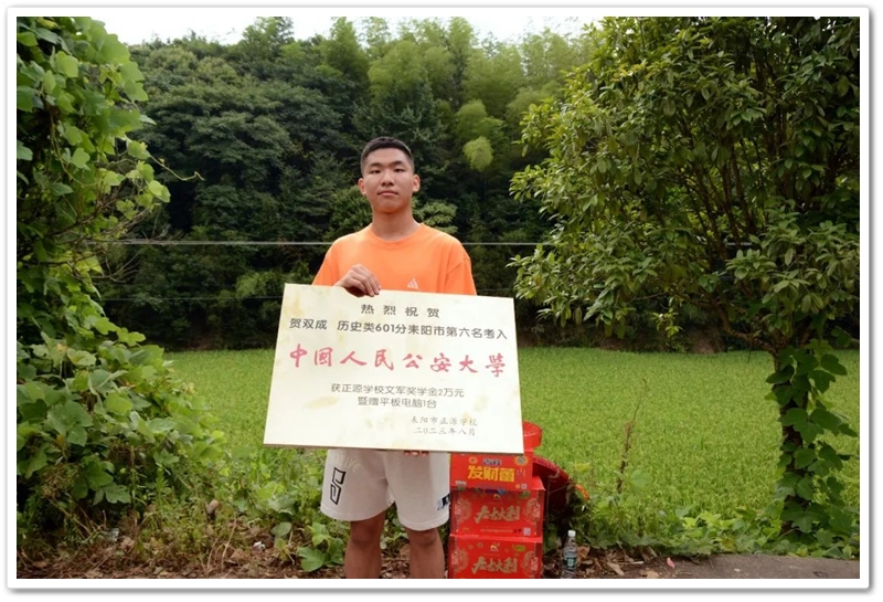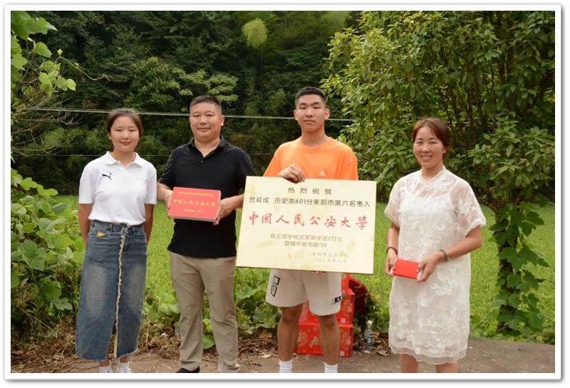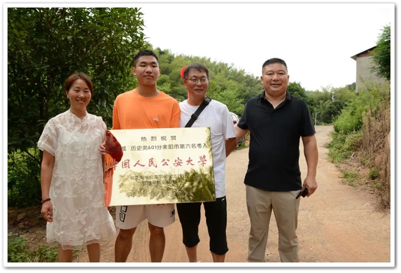 8月1日清早,罗校长率高三年级主任陈斌、班主任赖继承及老师同学们驱车40里路,带着铜匾、平板电脑和2万元文军奖学金浩浩荡荡来到新市镇黄泥村12组,向茅坪里乡亲们贺喜,祝贺山村里的贺双成同学以历史类601分、耒阳市第六名的成绩考取中国人民公安大学。