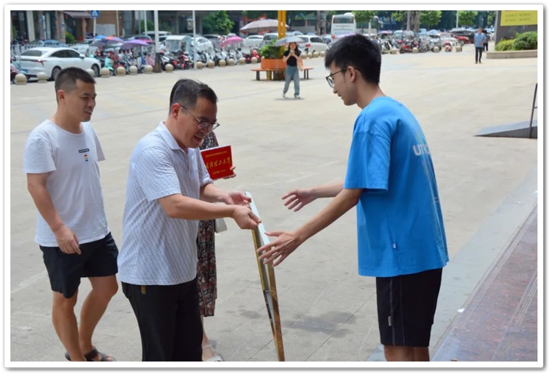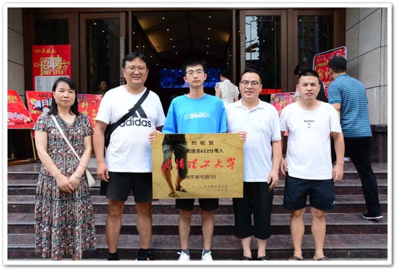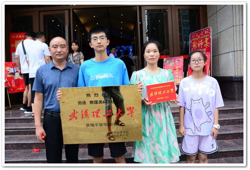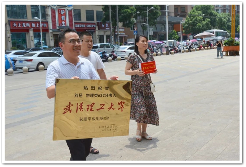 8月8日,正源学校党支部书记兼复读部主任毛小波率高三复读部老师同学们来到西湖路,他们带着铜匾、平板电脑和满满的衷心祝福,恭喜刘扬复读一年提升79分以622分的优异成绩考取武汉理工大学。