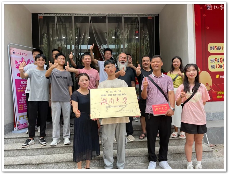 黄市镇黄市村九组周福勇、何玲英夫妇8月19日在灶市“灶家灯火”办酒,庆祝儿子周杨物理方向635分考取湖南大学。上午十点多钟,罗湘云校长率班主任贺小运、初中年级主任尹柏林等老师举着、端着恭贺铜匾、奖品华为平板电脑向周家贺喜。酒店门前,罗校长主持简短颁奖仪式,周杨和母亲何玲英恭之敬之接过铜匾和平板电脑,脸上写满笑意和自豪。