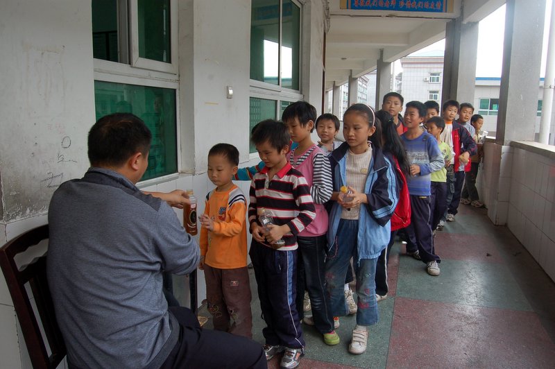 学生排队打药、喝药