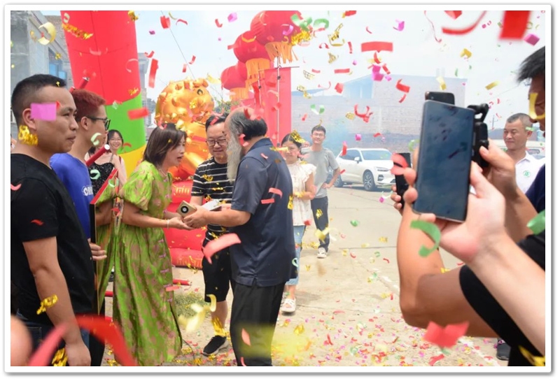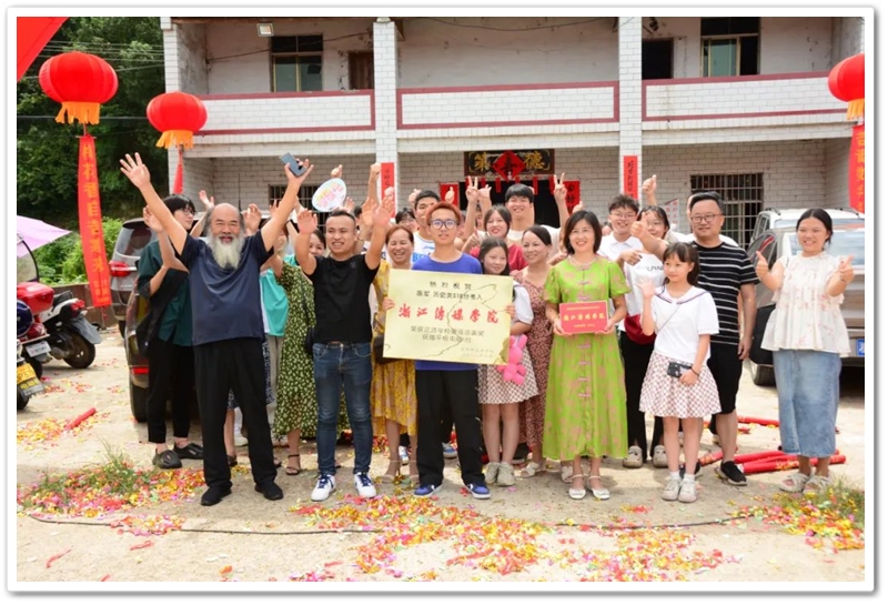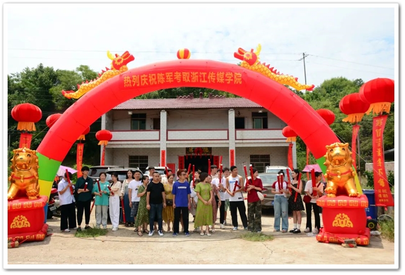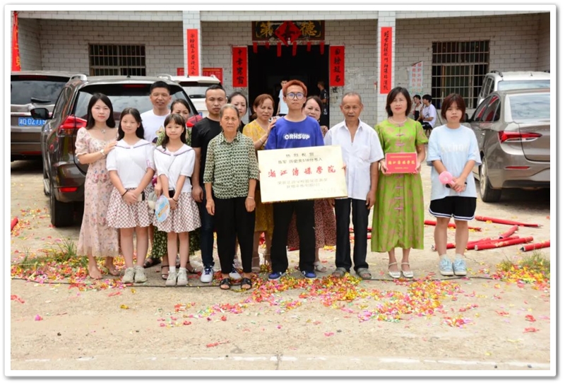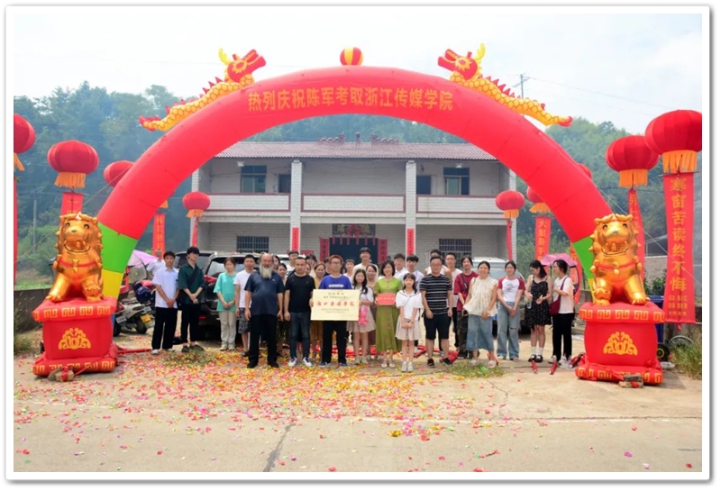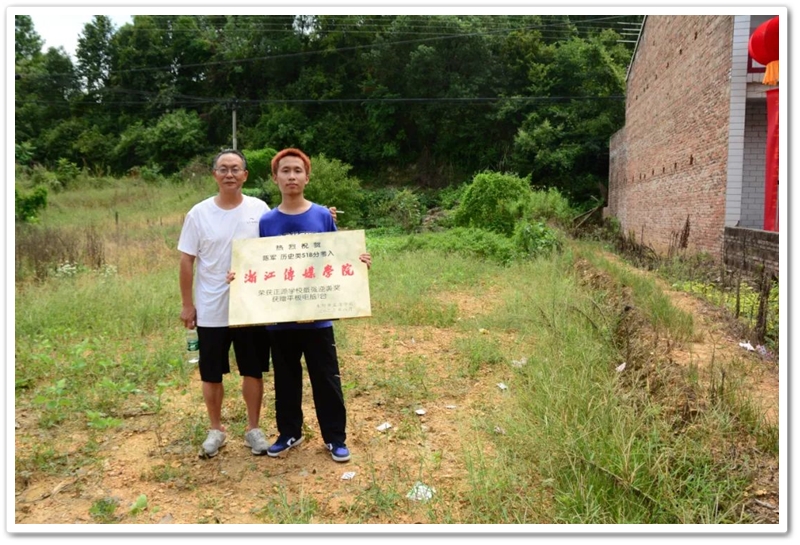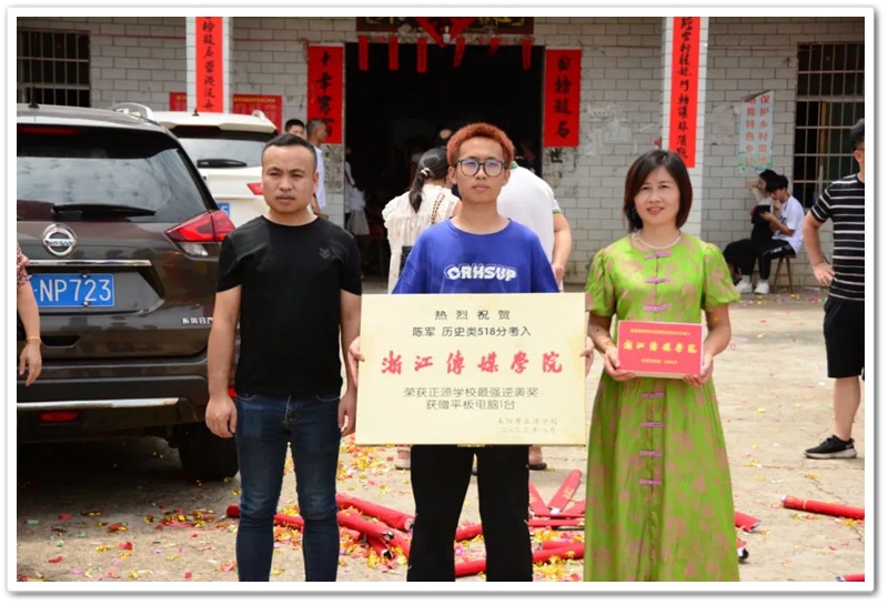 8月21日,罗校长率高三年级主任陈斌、班主任赖继承和老师同学们带着铜匾、平板电脑来到泗门洲7组,祝贺陈军历史类518分,艺考逆袭浙江传媒学院。