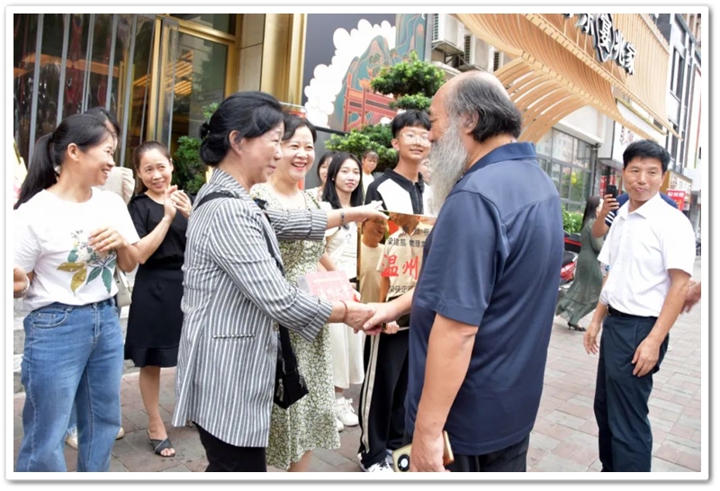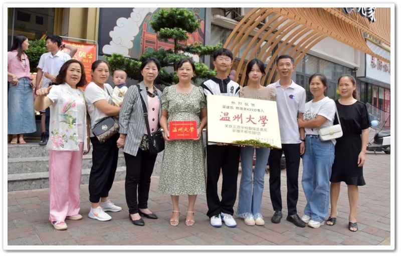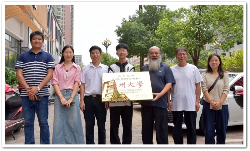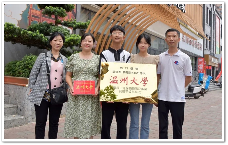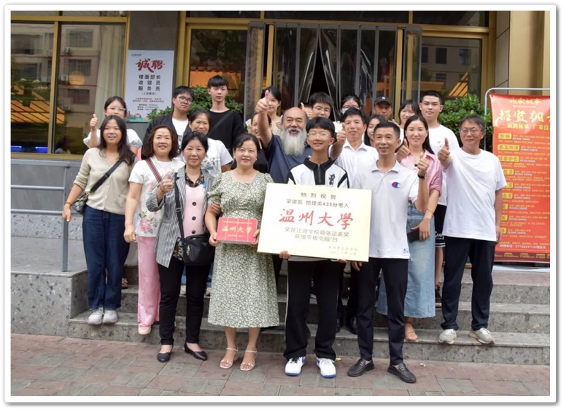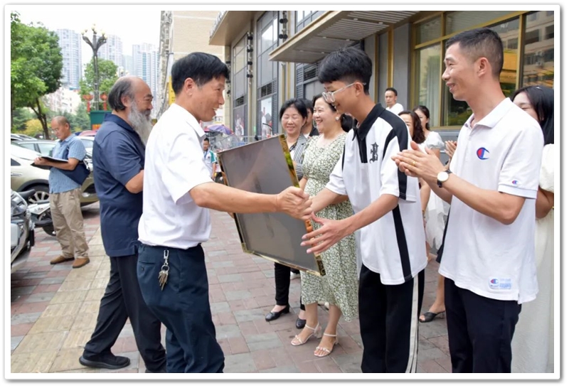 中午十二点,罗湘云校长率副校长周济龙,校工会主席、上届高三年级主任陈斌等到达酒店,郑重的向梁建凯颁发“最强逆袭奖”奖牌和奖品华为平板电脑,与众亲友一起为梁建凯零基础学美术考取一本高校温州大学点赞。