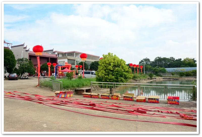 从进湾的路口到广场,摆满了鞭炮礼炮,点炮手已就位,翘首以待嘉宾。