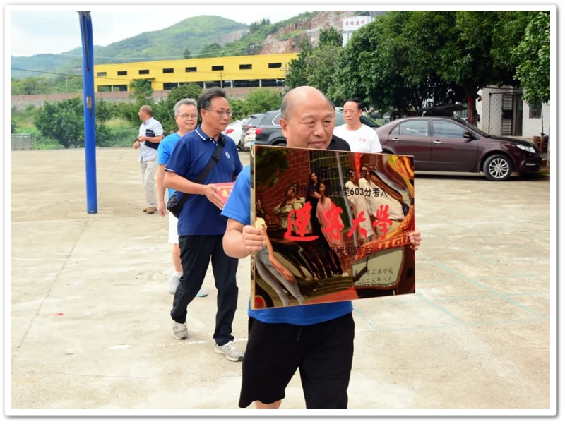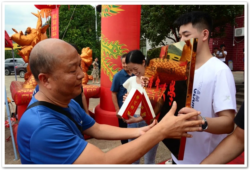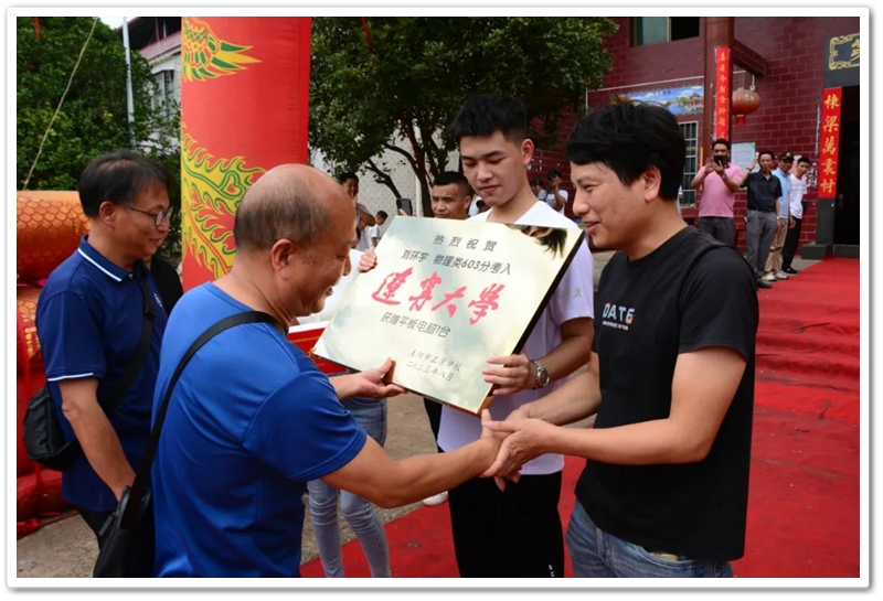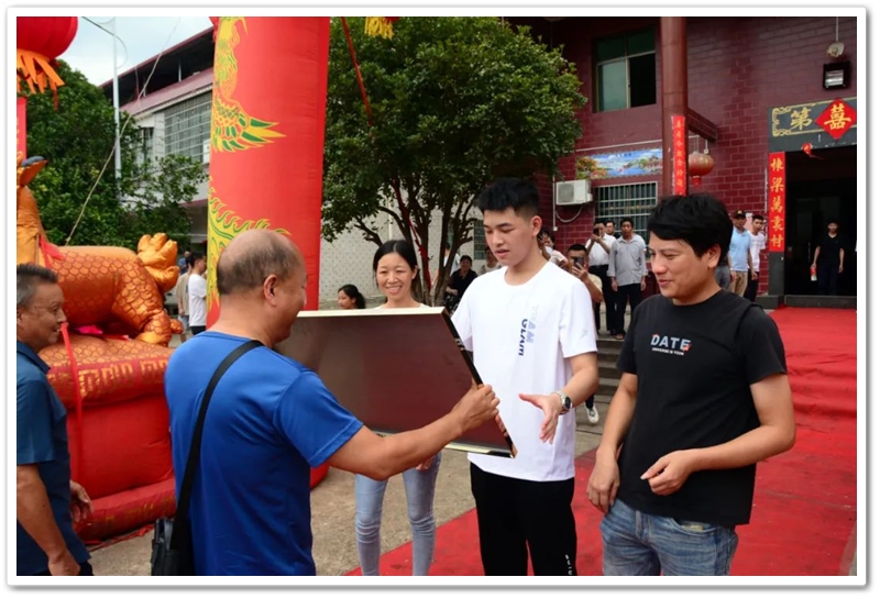 中午十二点多,上届高三年级主任、学校工会主席陈斌率班主任董树伟、物理老师王勋锋到达两路口新湾。一时间,锣鼓喧天,鞭炮大作,礼炮轰鸣。陈主席、董老师郑重颁奖,掌声、恭贺声、感谢声、鞭炮礼炮声汇成一片,湾村一派喜庆气氛。