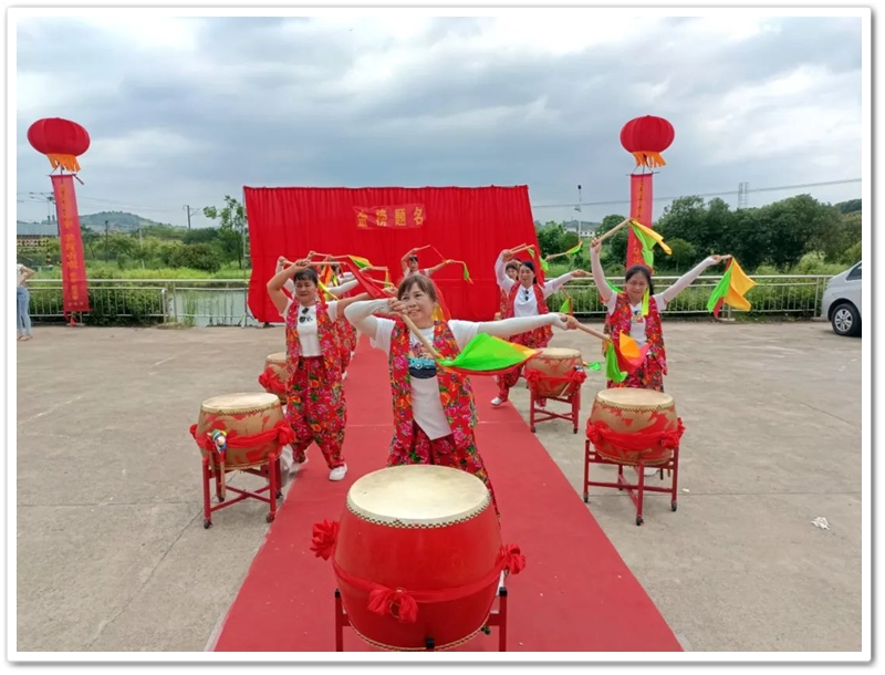 两个大音箱最大音量的播放着《今天是个好日子》等喜庆歌曲。从广场到正厅屋前,沿路悬挂着大红灯笼和祝贺彩条。正厅屋前安坐着大红充气拱门。一条大红地毯从广场中央直铺到正厅屋门口。10位大妈组成的锣鼓队正合着震耳欲聋的音乐载歌载舞。