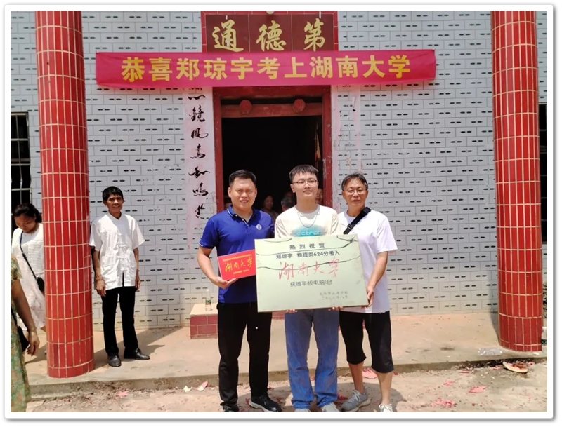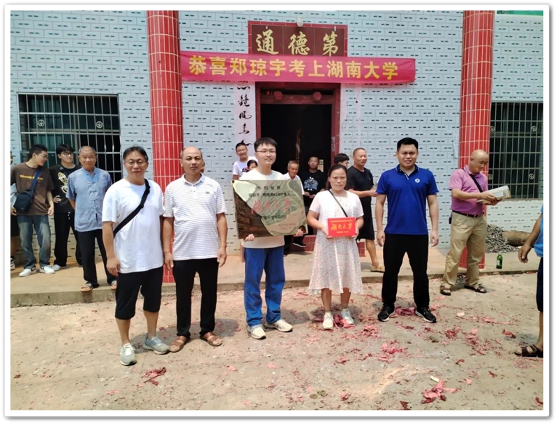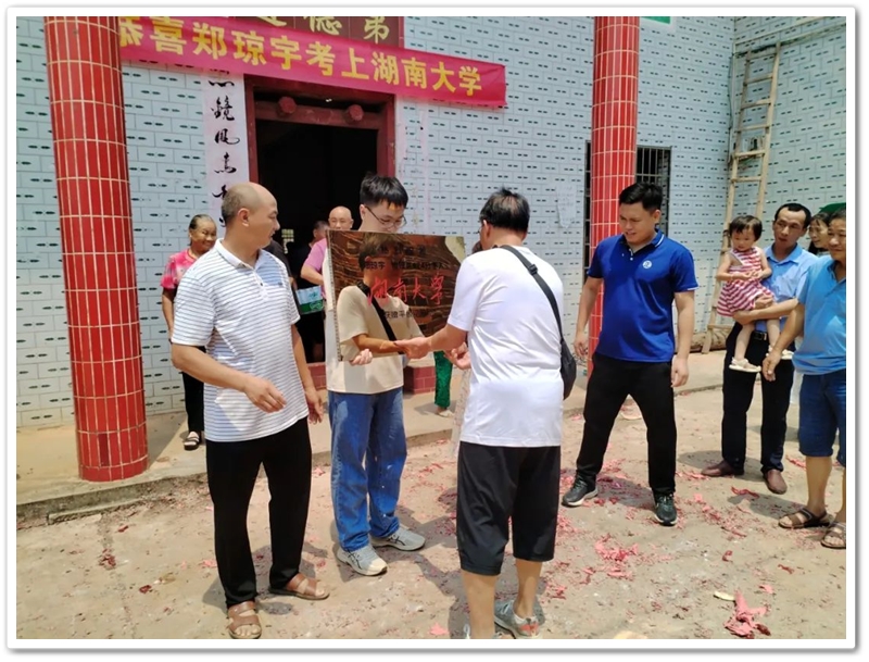 8月14日上午十一点左右,离开新市段布冲贺翔家,年级主任陈斌、谢海明老师以及几位同学驱车前往洲陂郑家湾,带着恭贺铜匾、奖品华为平板电脑以及鞭炮礼炮为624分考取湖南大学的郑琼宇贺喜。郑琼宇与其父母、爷爷奶奶、姑爷爷以及亲朋好友顶着烈日列队迎接。简短的送奖仪式过后,鞭炮大响,礼炮轰鸣,湾村一片热闹,一片喜庆。