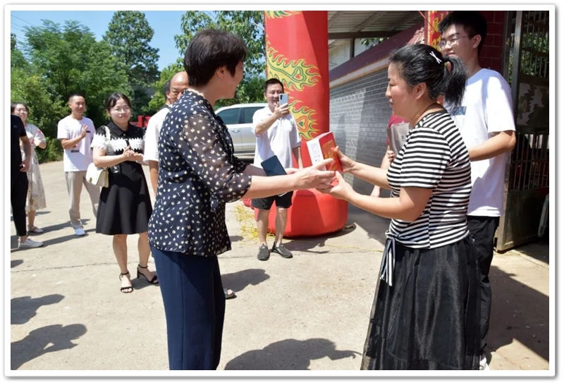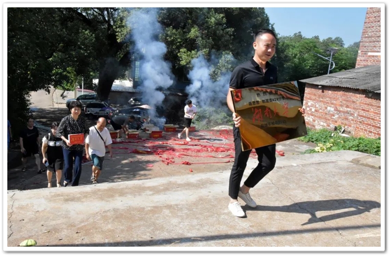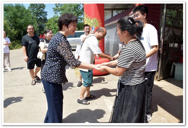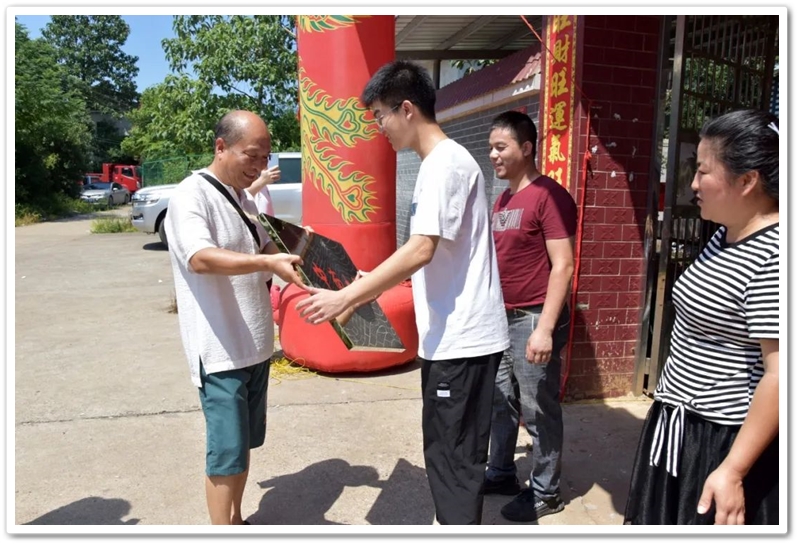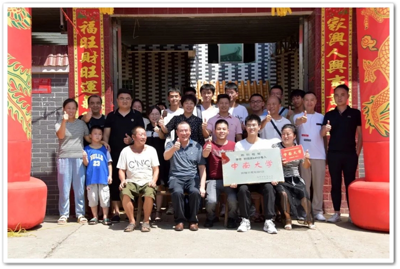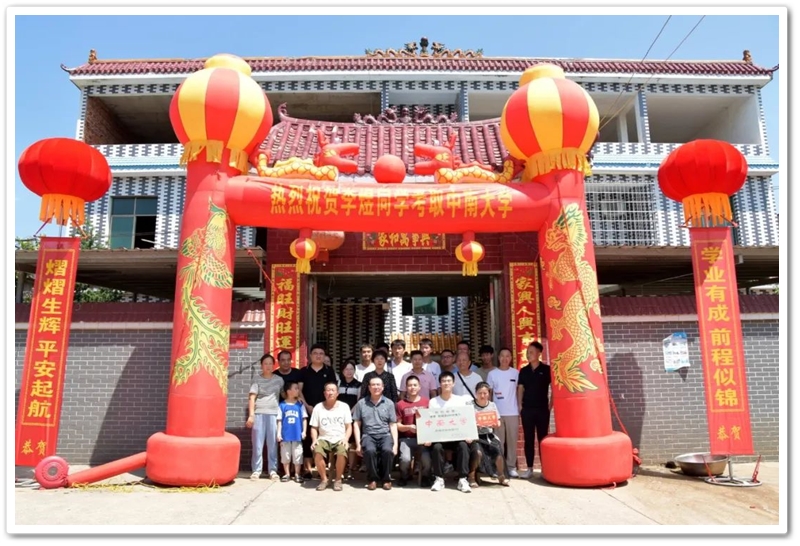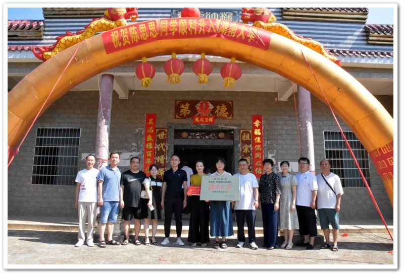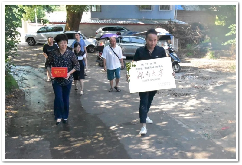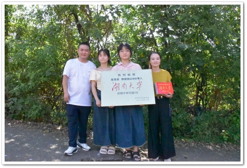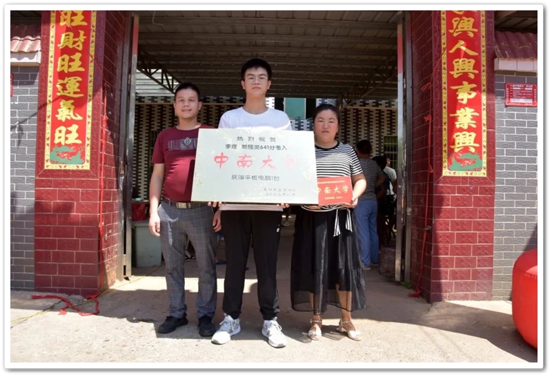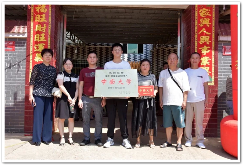 校长夫人梁晓芬老师率高三年级主任陈斌、213班班主任董树伟、218班班主任李广及老师同学们,带着铜匾和平板电脑最先来到遥田镇,祝贺镇里陈思思、李煜两个留守儿童高分考取湖南大学、中南大学两所985名校。