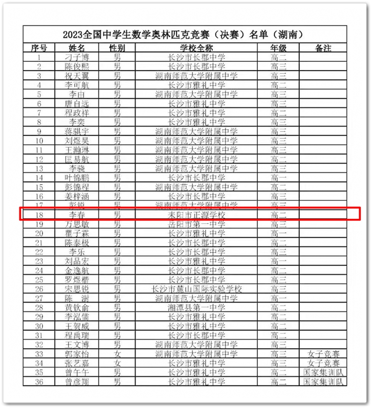 正源奥赛再创新高!高二年级李春同学入围湖南省数学奥赛队