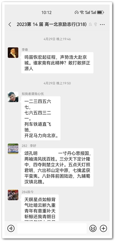 初高中阶段各项有益身心、有益学业的活动,李春一项不落,阳光、健康地茁壮成长。今年五一期间免费参加北京励志行,故宫、天坛、长城、天安门、王府井、抗日战争纪念馆,处处活跃着李春朝气蓬勃的身影。他说:“珍存心中的梦想,低着头跑在独属于自己的征程上,我终会抵达那梦想的高峰,一览这世界的壮阔。”