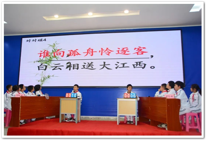 比赛初期,双方互不相让,一句接一句地吟诵出对应诗句,第三、四环节中370班略胜一筹,最终370班以30比15的优势,取得第一轮第五场胜利。