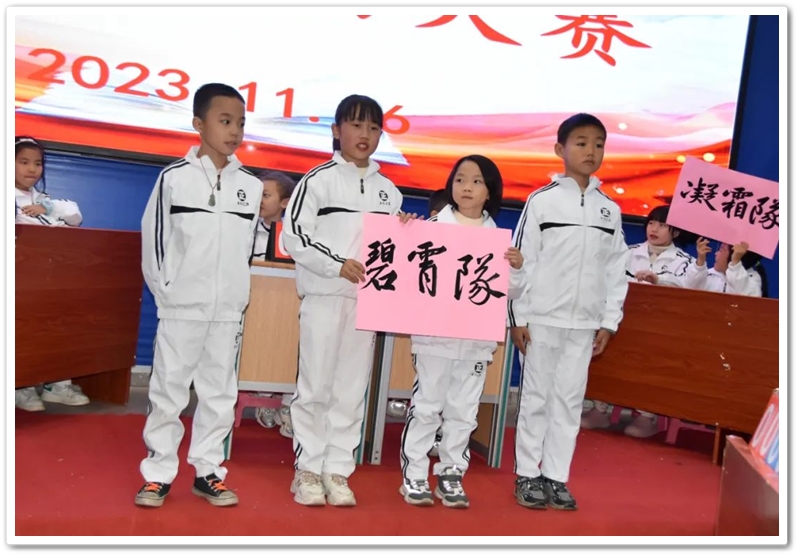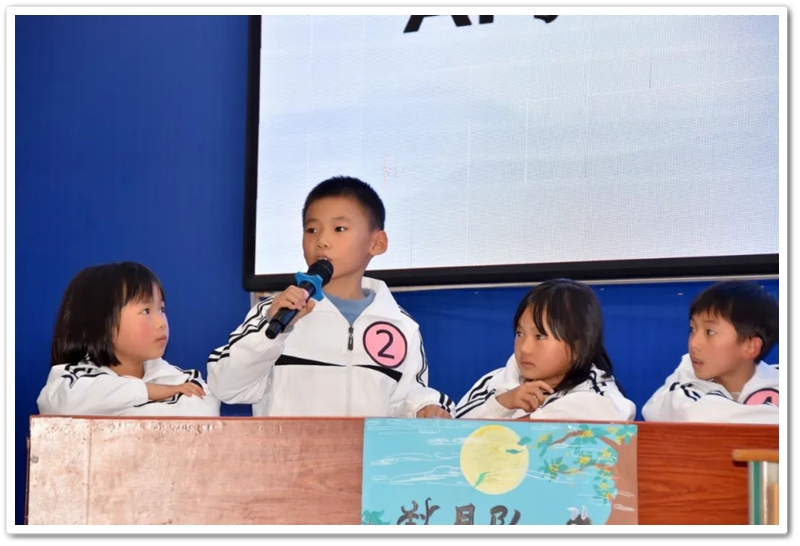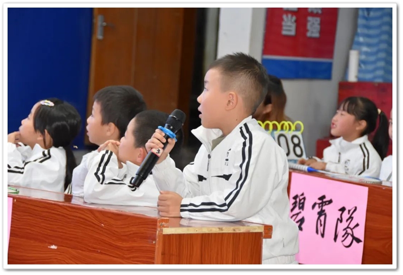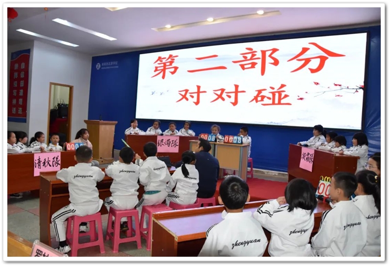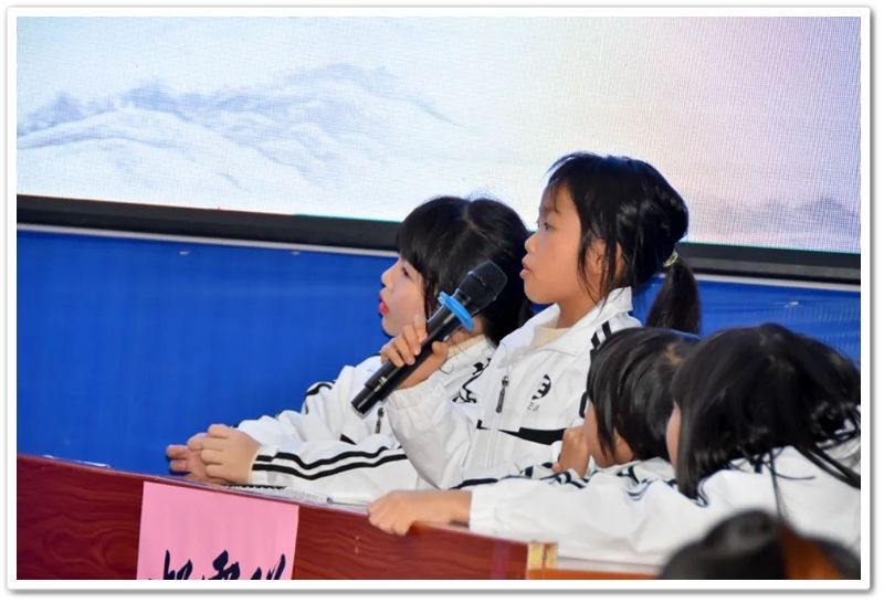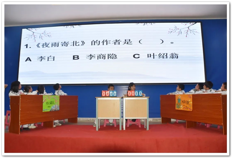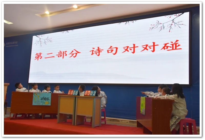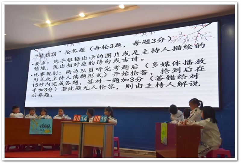 孩子们就地取材,分别从背诵的古诗词当中提取自己的口号及队名。本次大赛三年级的孩子们采取积分制的形式,五个班级齐上阵。通过4个环节的比拼,最终通过最后的得分产生冠军。整个比赛过程中,五个班级的同学们,他们都以极高的热情和认真的态度对待这次比赛。他们在台上尽情展现自己的才华和魅力,台下的观众们也被他们的表演所吸引和感染。他们的表现赢得了评委们的高度评价和观众们的热烈掌声。