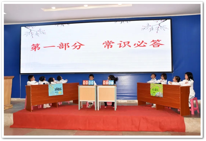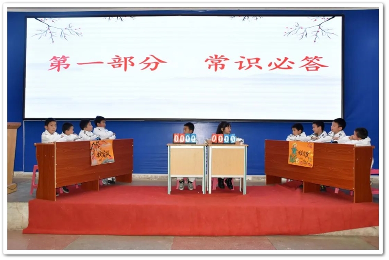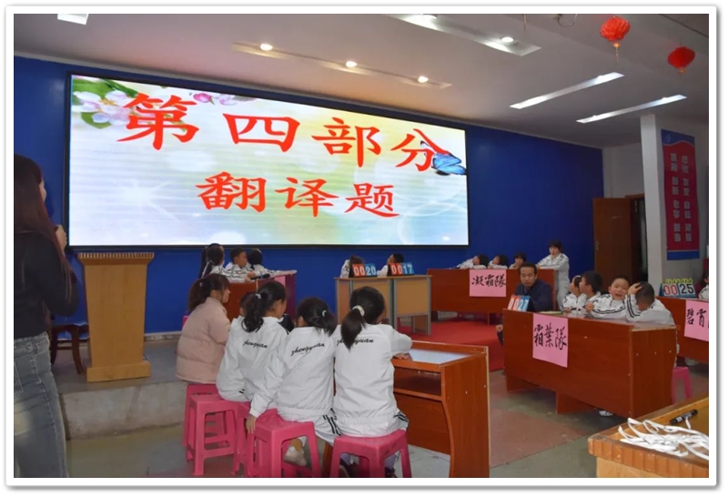 晚上7点,三年级孩子们活泼表演的《彩虹的微笑》舞蹈,拉开了本次活动的序幕。本次比赛,由各班选出4名队员作为班级代表参加,比赛分四个环节进行:①必答题 ,②对对碰 ,③猜猜猜 ,④翻译题。首先上场的是三年级五个班级的选手们。他们一个个精神抖擞,神采奕奕。紧接着各班参赛选手们在一声声呼号中展示自己队伍的风采。