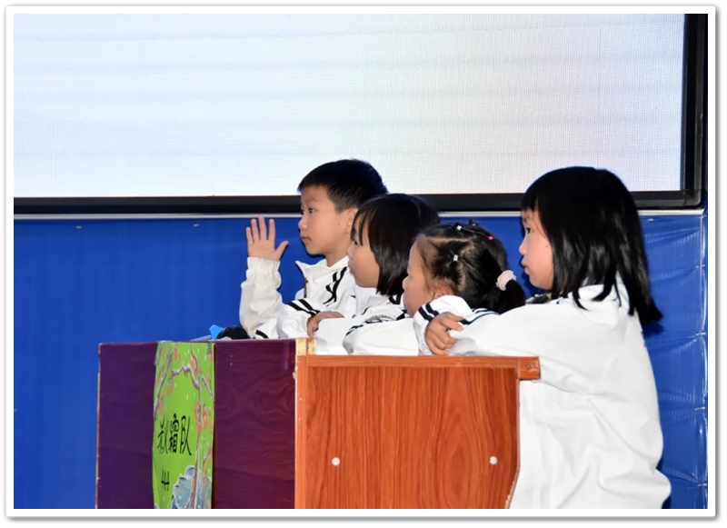 看着台上精彩的比赛,台下二年级的选手们早就等不及了。三年级的选手们在主持人的指导下有序退场后,舞台马上交给跃跃欲试的二年级小选手们。首先是在主持人的带领下,各班队员们进行风采展示。