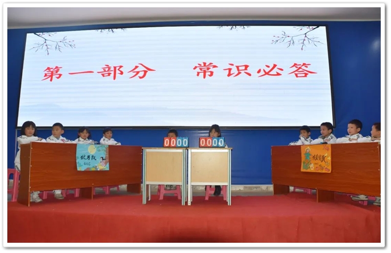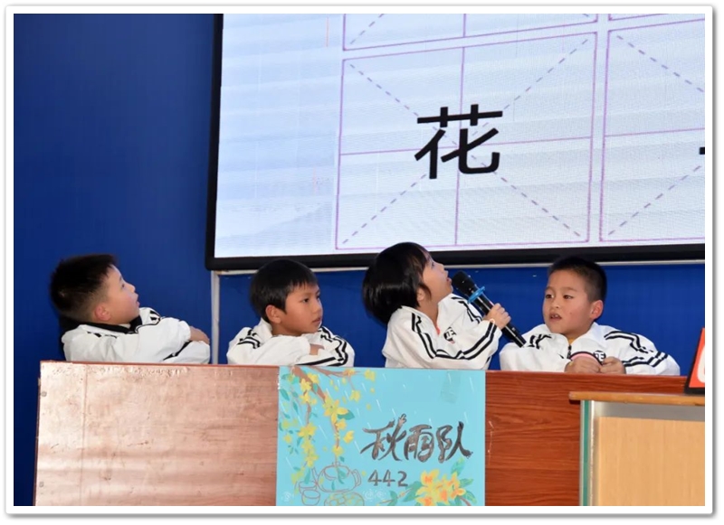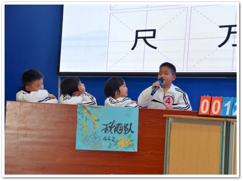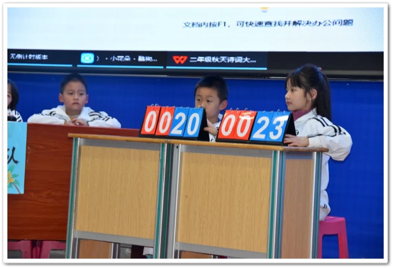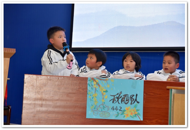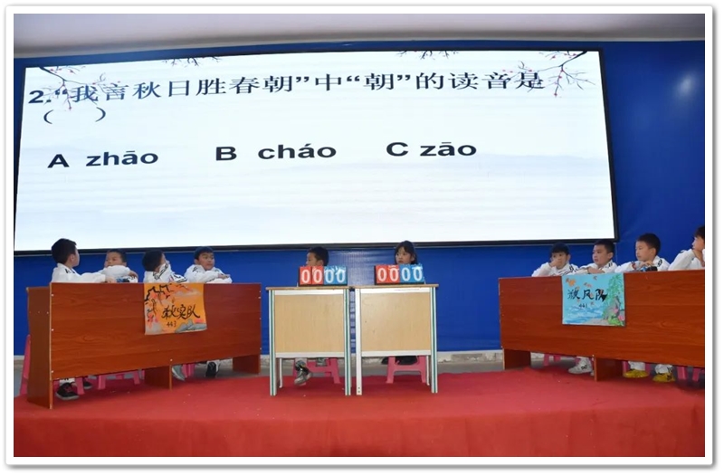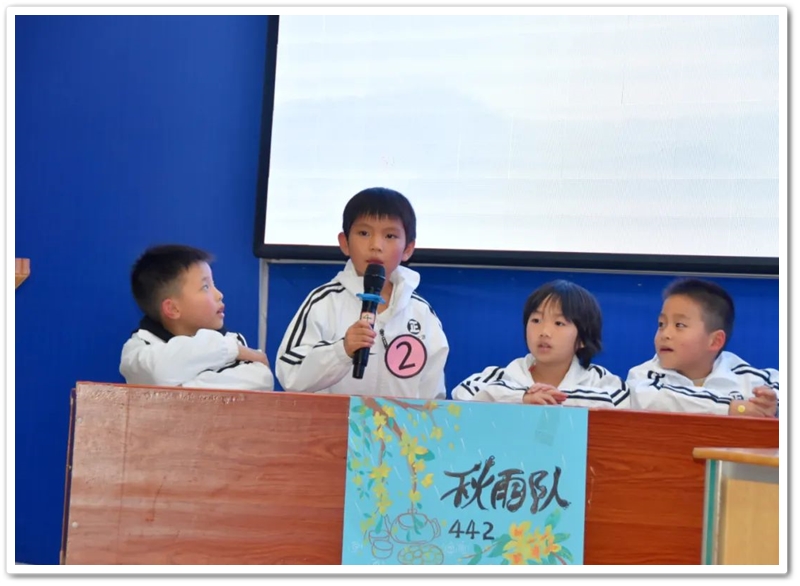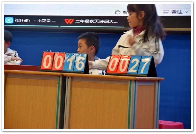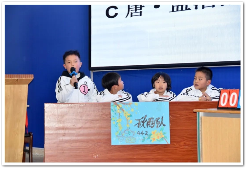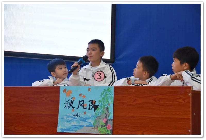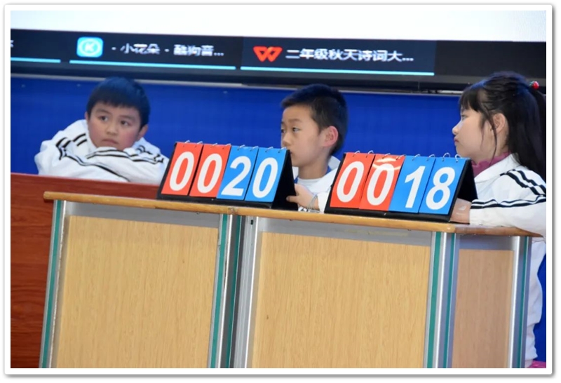 在主持人宣讲完比赛规则和基本环节后,小选手们已经有序就位了。首先进行第一轮第一场对决的是代表442班的秋风队和代表444班的秋霜队。台上的小选手们一个个聚精会神听主持人读每一道题目,脑子飞快地运转,生怕自己答错一道题,失去进入下一轮比拼的机会。比赛期间,小选手们对答如流,一句接一句地吟诵出对应诗句,最终444班秋霜队以23比20的分数,险胜442班秋雨队,晋级到下一轮比赛中。