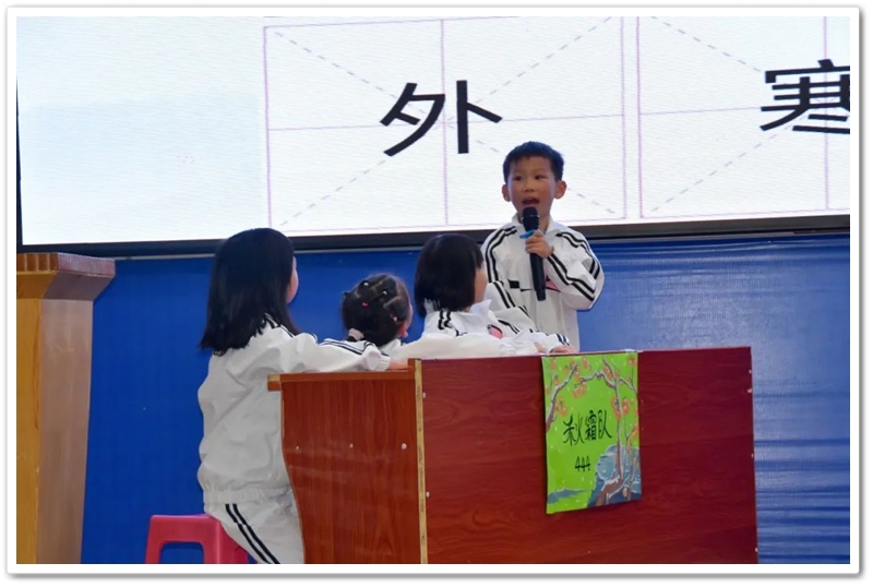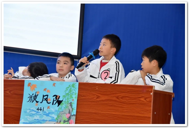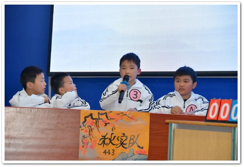 激动人心的环节到了,下面进入最后一轮冠军的争夺赛。由刚刚险胜的445班秋收队和前期成功晋级的443班秋实队进行PK。最终的冠军争夺赛紧张而又刺激,双方水平不分上下,最有趣的要数第三环节的猜猜猜和第四个环节的翻译题。经过双方队员们以迅雷不及掩耳之势争夺抢答权,然后起身自信的说出图片所包含的诗句答案。整个过程中掌声此起彼伏,小选手们尽显少年风采。二年级的孩子们用自己对诗句的理解答出一道道翻译题。最终代表445班的秋收队以27分的成绩摘得桂冠。小选手们欢呼雀跃,喜不甚收。