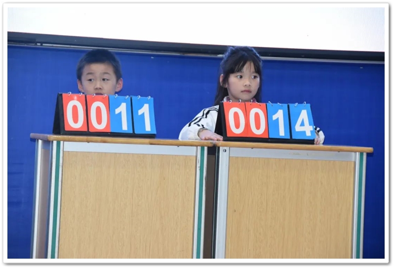 经过前面三场的比拼,获胜的三个班级分别由班主任现场抽签决定进入第二轮的比赛。第二轮分别是由代表444班的秋霜队和代表445班的秋收队进行PK。时间一分一分地过去,队员们争分夺秒,孩子们情绪高涨。最终445班秋收队以14分高出444班秋霜队3分的成绩险胜。