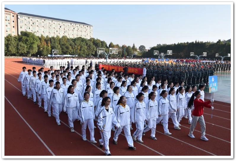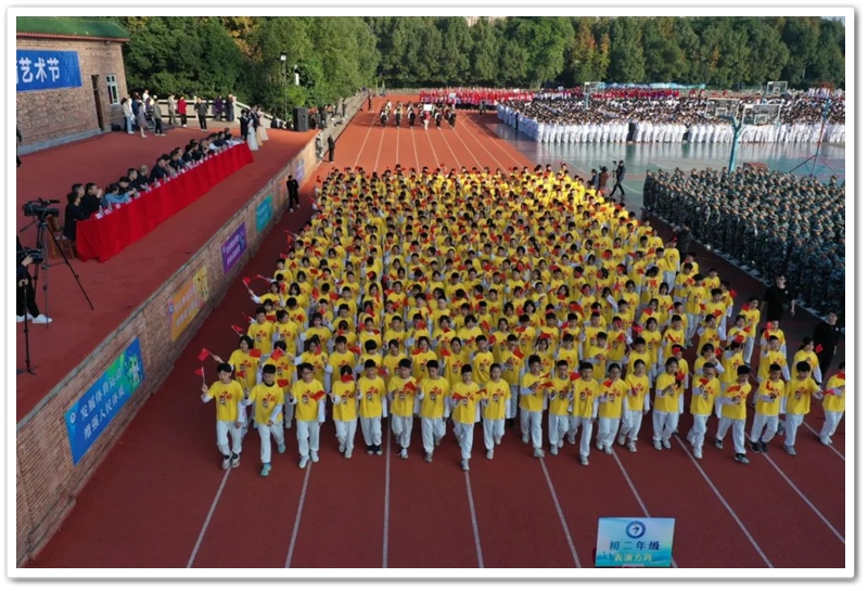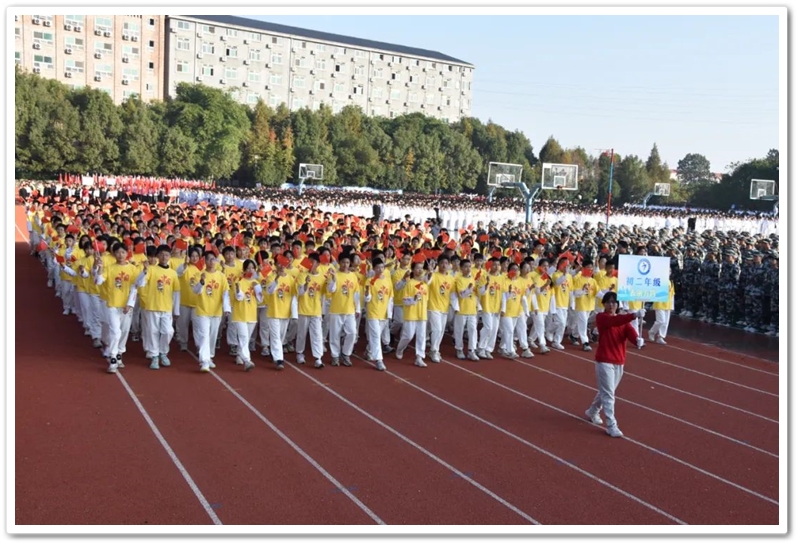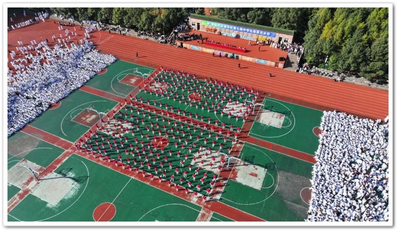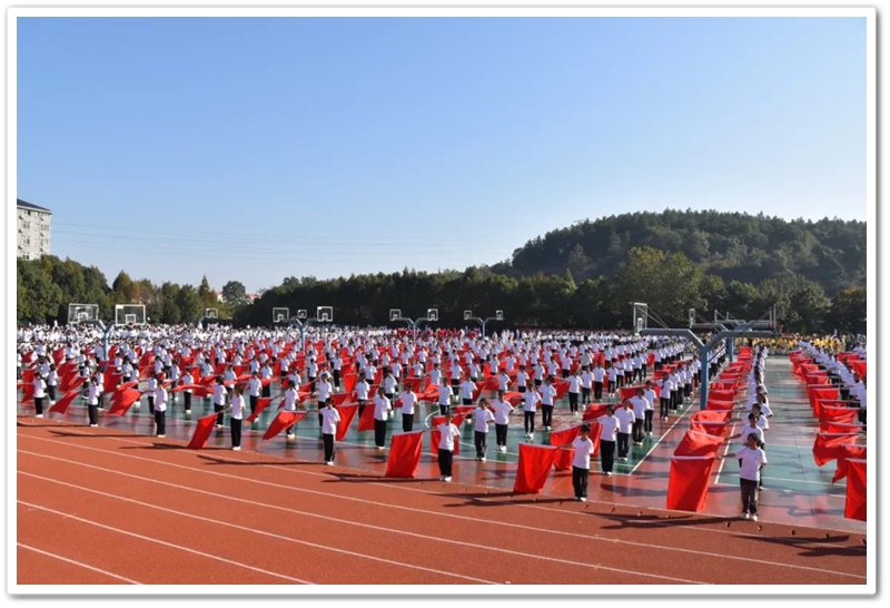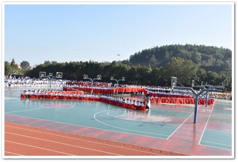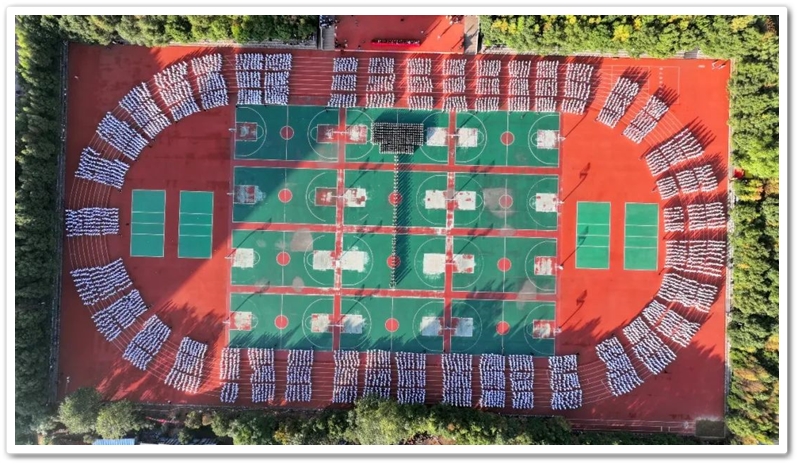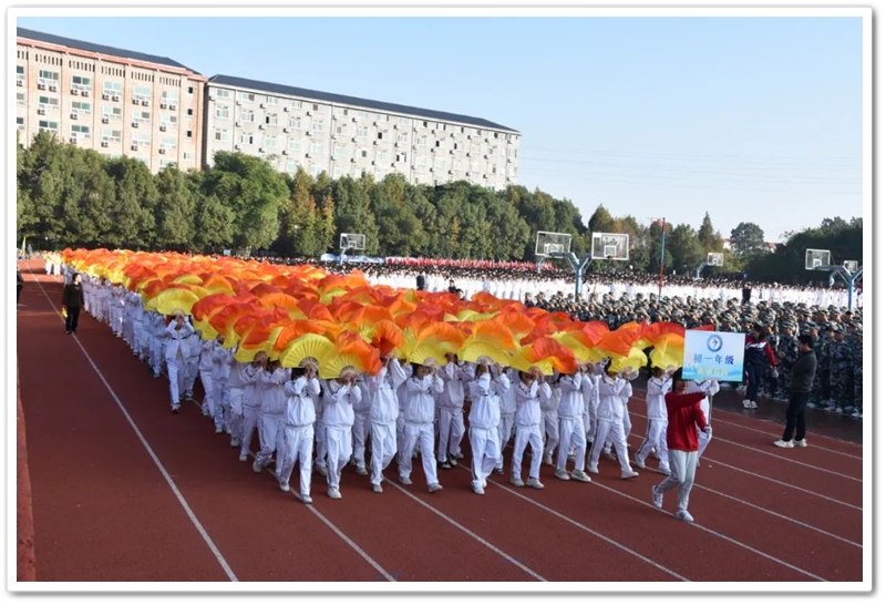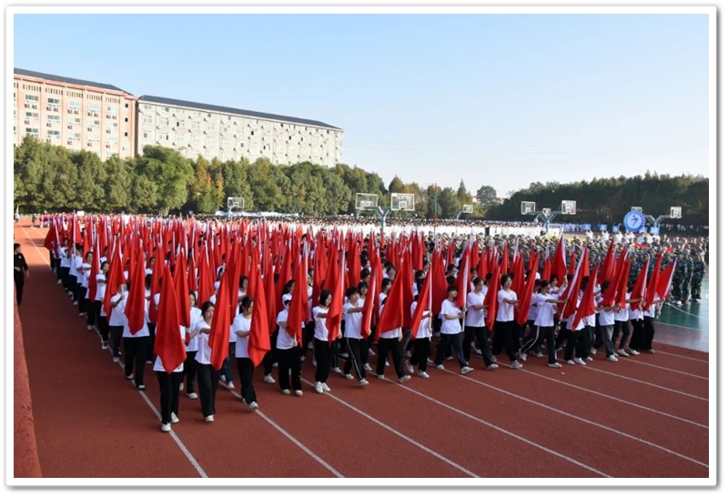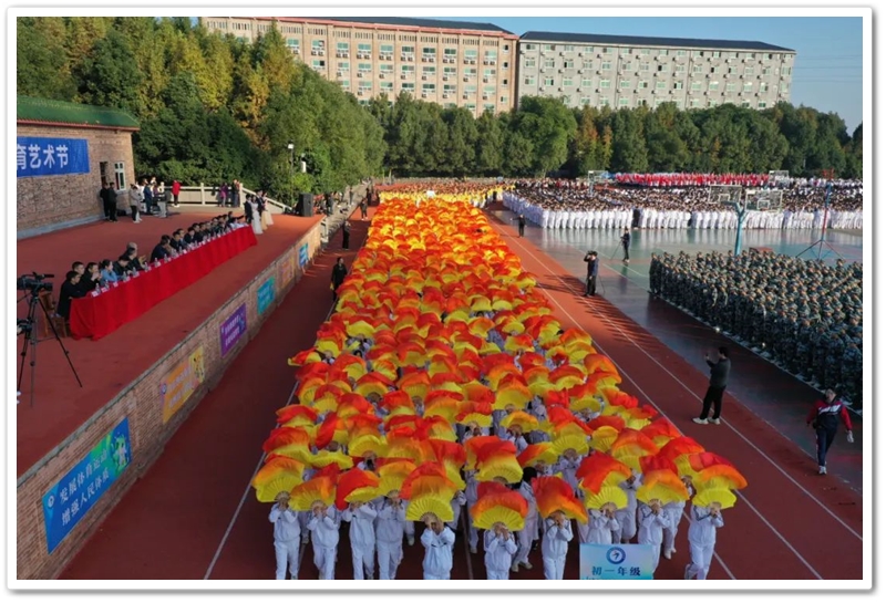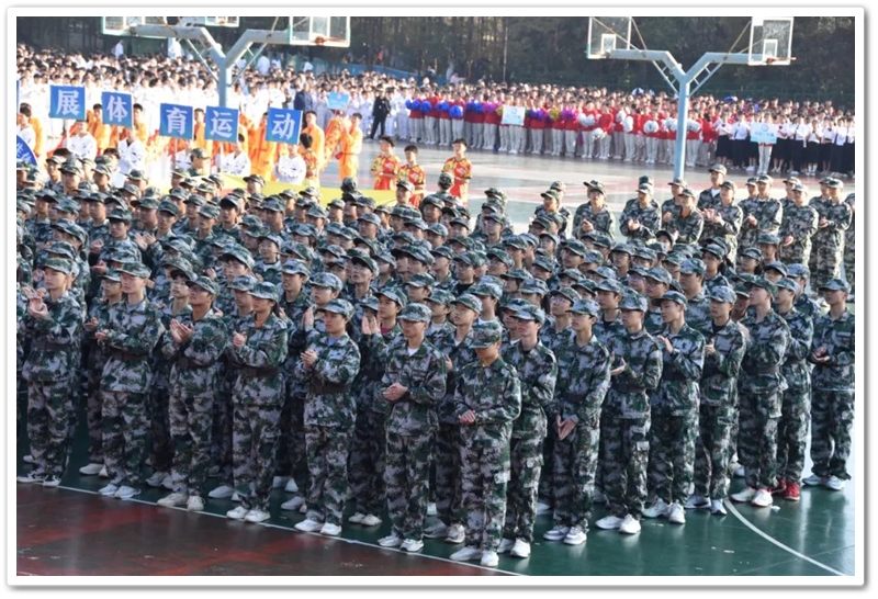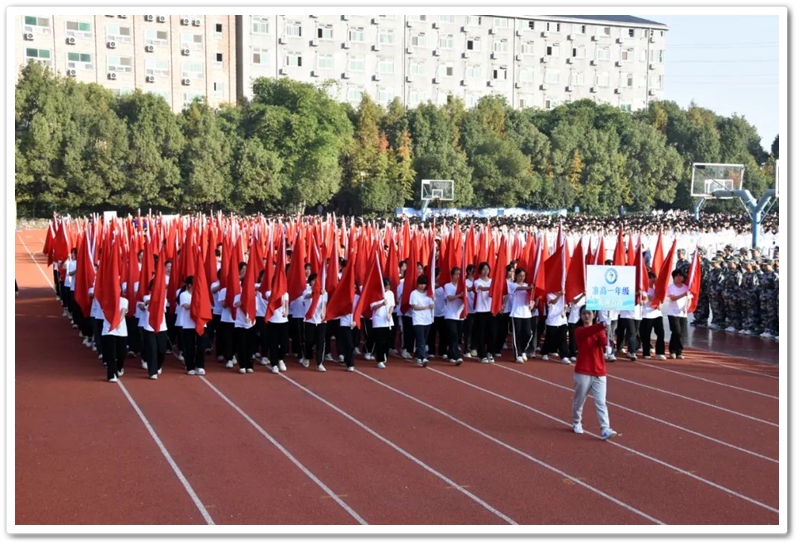 入场式完毕,主席台前南北两侧洁白的校服方阵、东向对面五彩缤纷的表演方阵将操场上的浩瀚画卷铺展得气势磅礴。高一学生构筑的迷彩旗杆基座端居正中央,国旗、校旗、金龙、憨狮、会徽、标语井然有序。