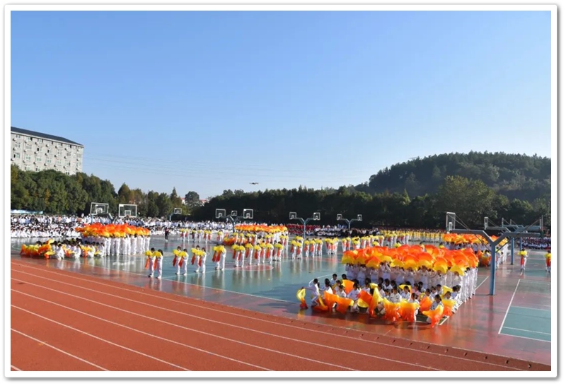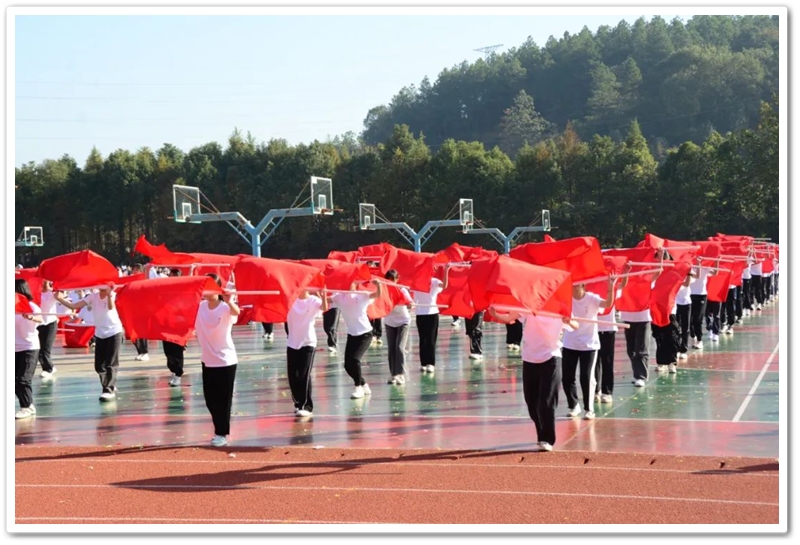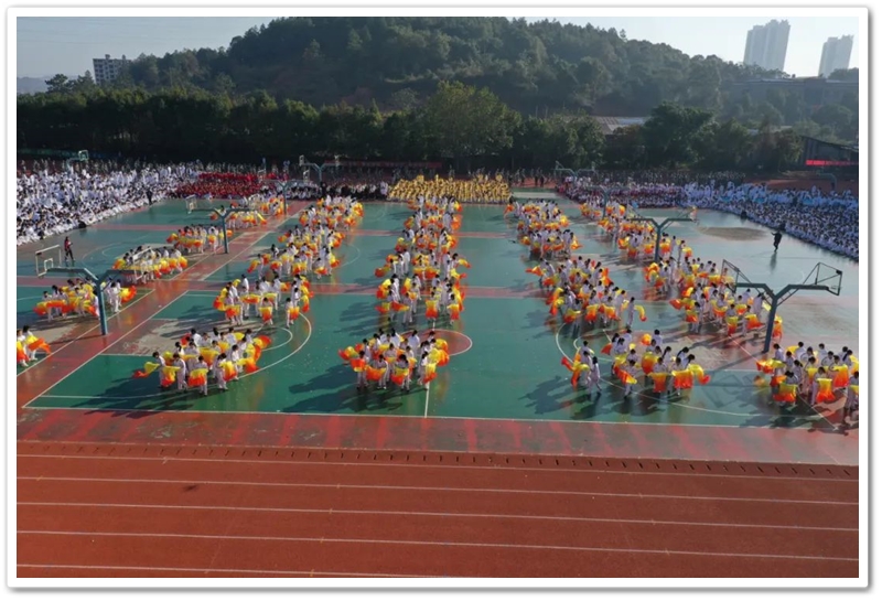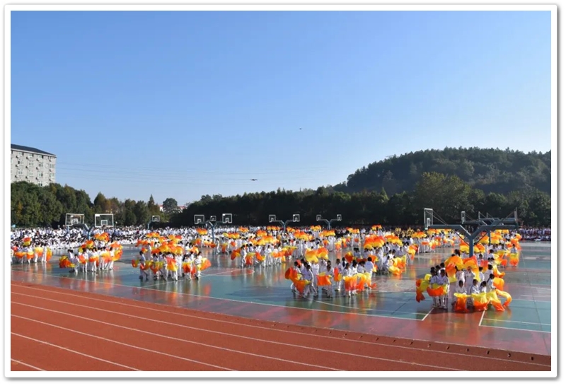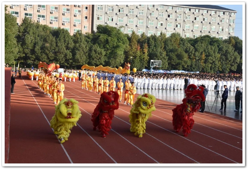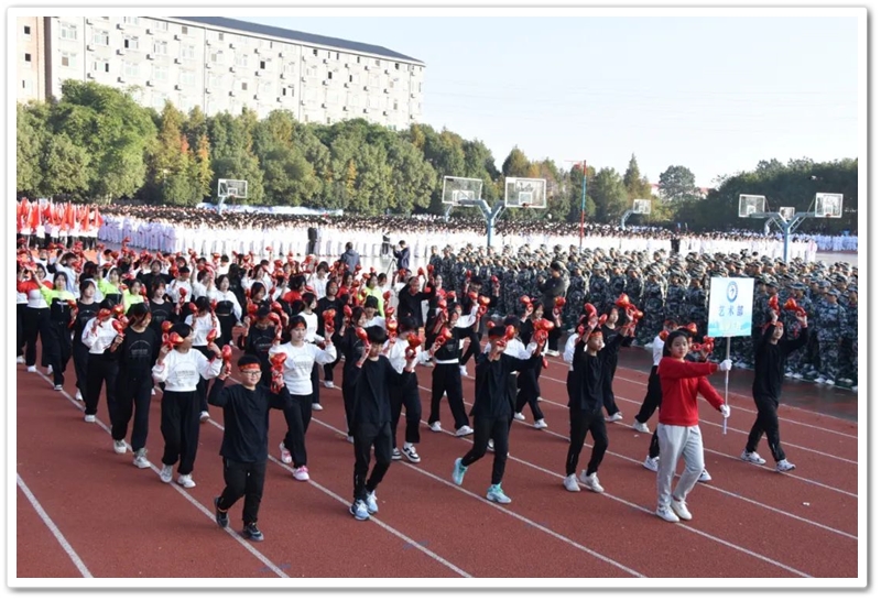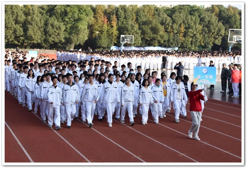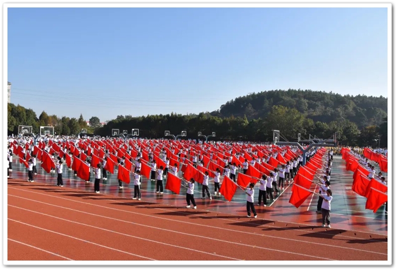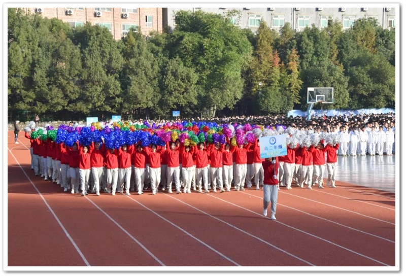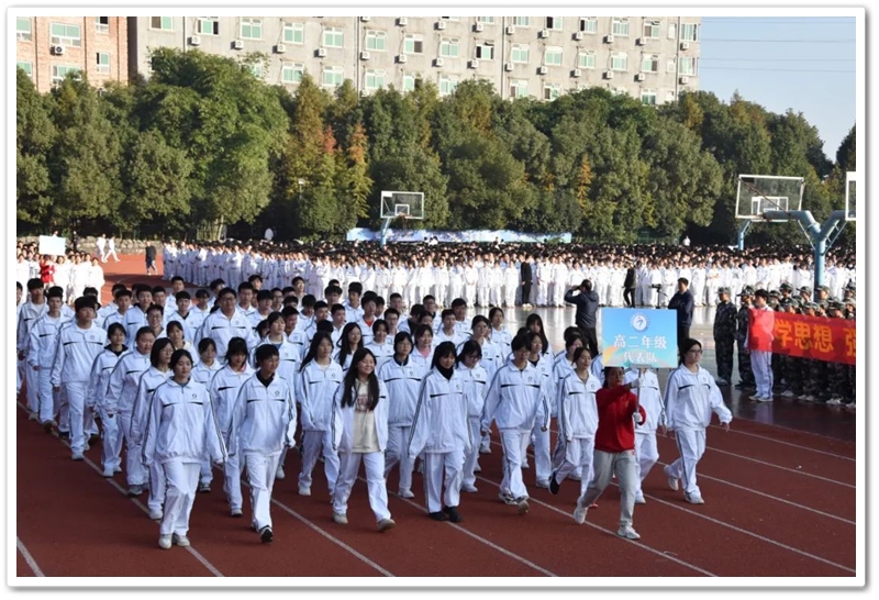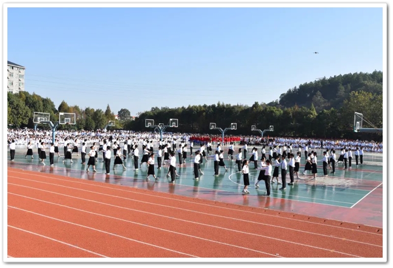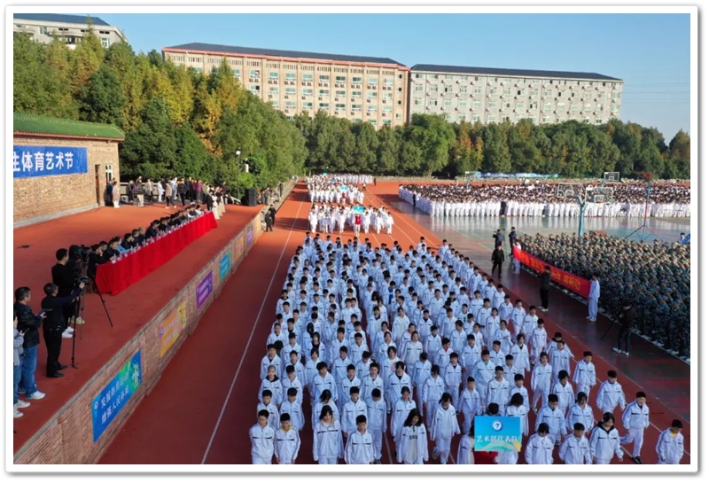 入场式完毕,主席台前南北两侧洁白的校服方阵、东向对面五彩缤纷的表演方阵将操场上的浩瀚画卷铺展得气势磅礴。高一学生构筑的迷彩旗杆基座端居正中央,国旗、校旗、金龙、憨狮、会徽、标语井然有序。