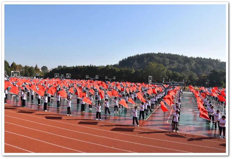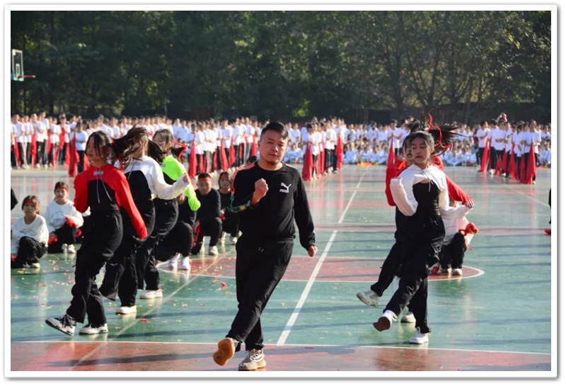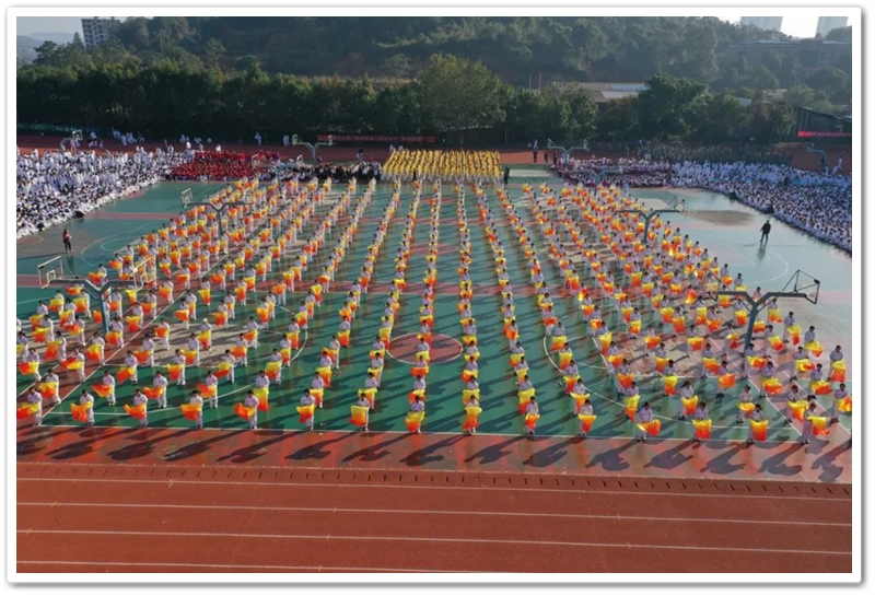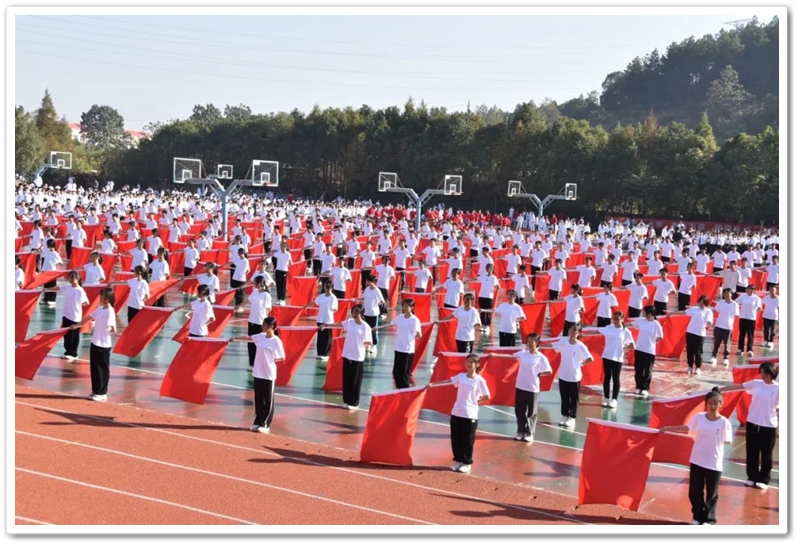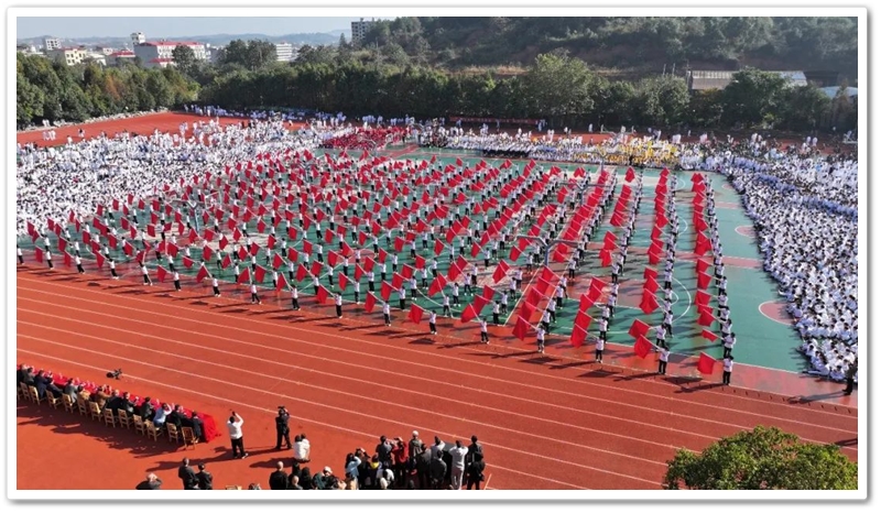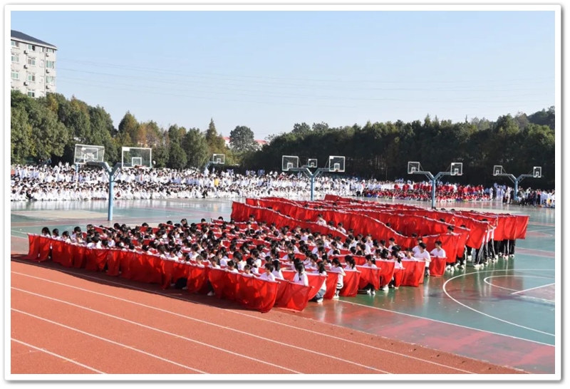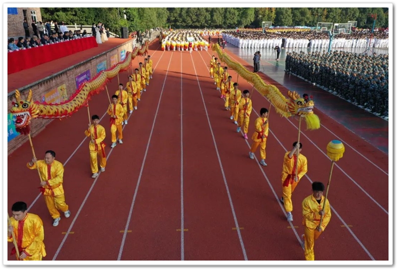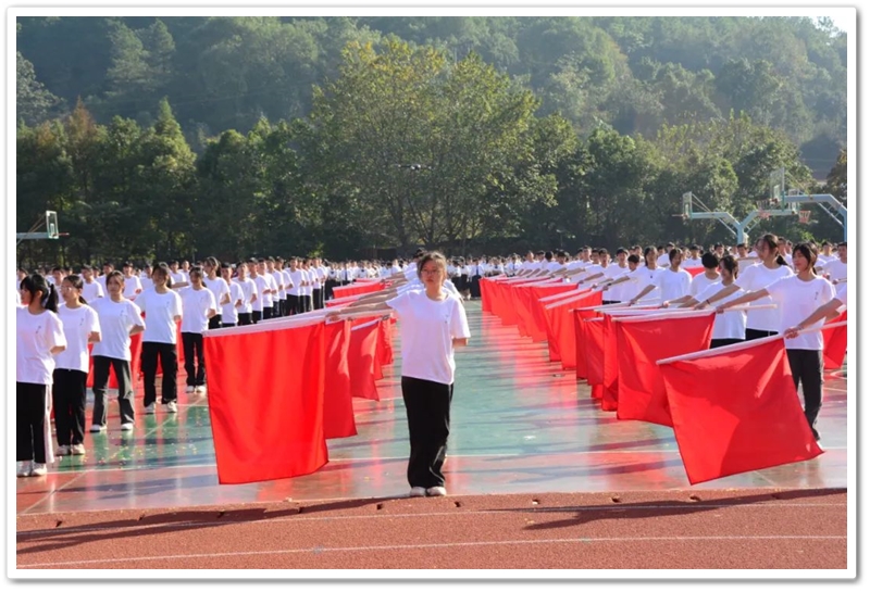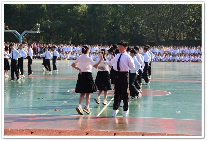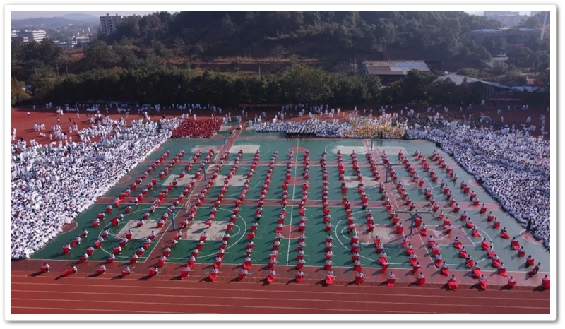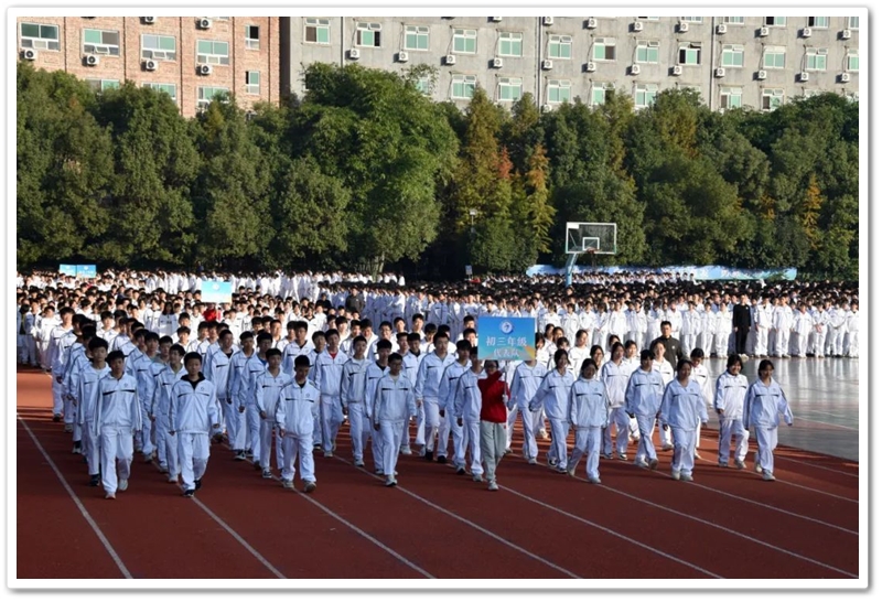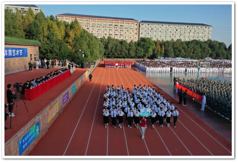 入场式完毕,主席台前南北两侧洁白的校服方阵、东向对面五彩缤纷的表演方阵将操场上的浩瀚画卷铺展得气势磅礴。高一学生构筑的迷彩旗杆基座端居正中央,国旗、校旗、金龙、憨狮、会徽、标语井然有序。
