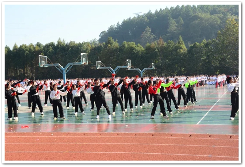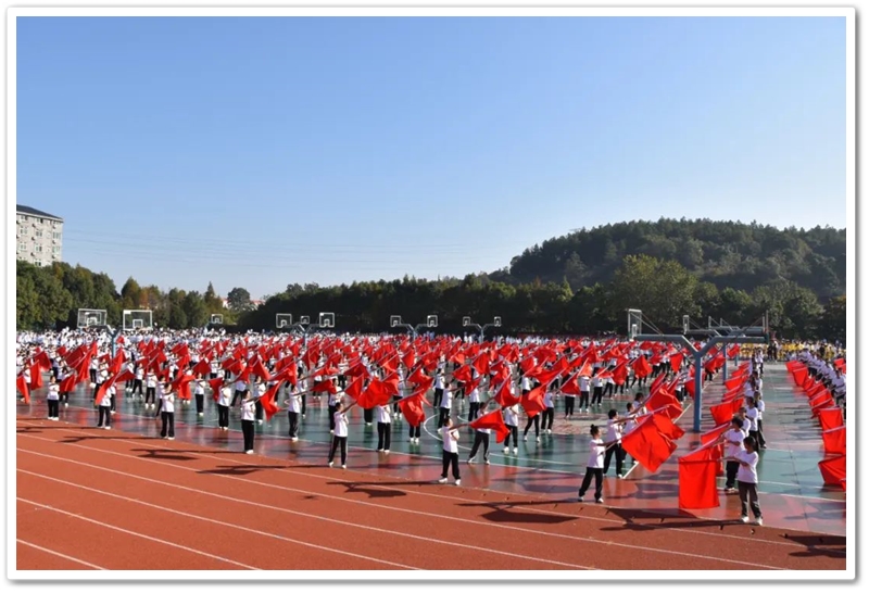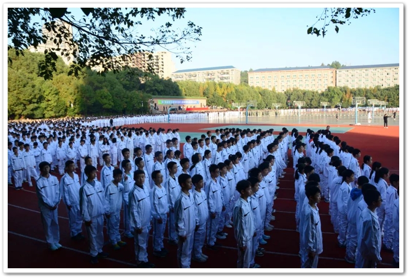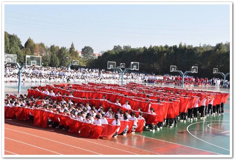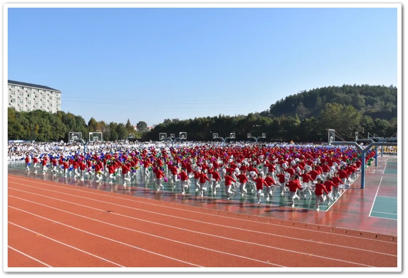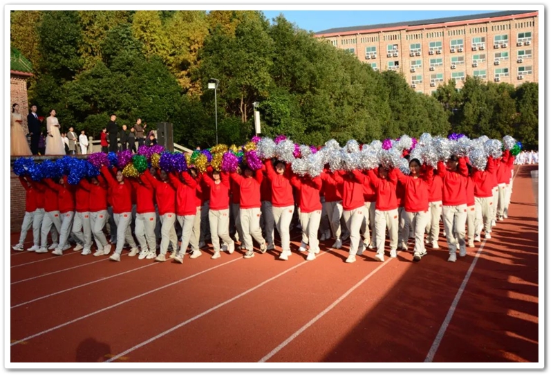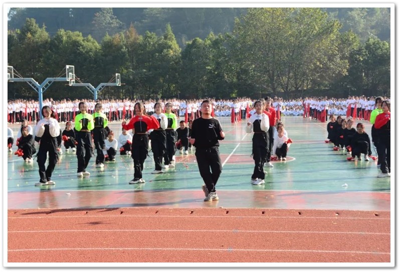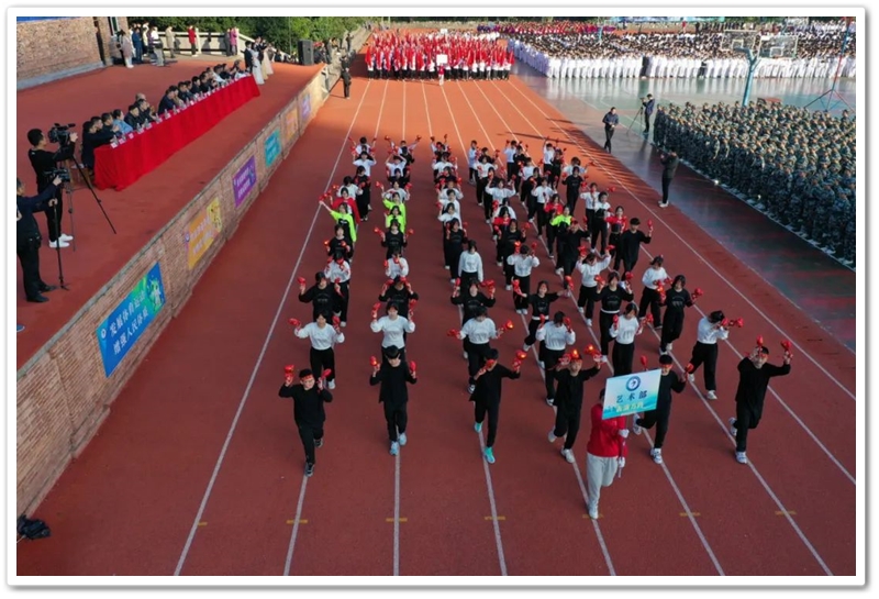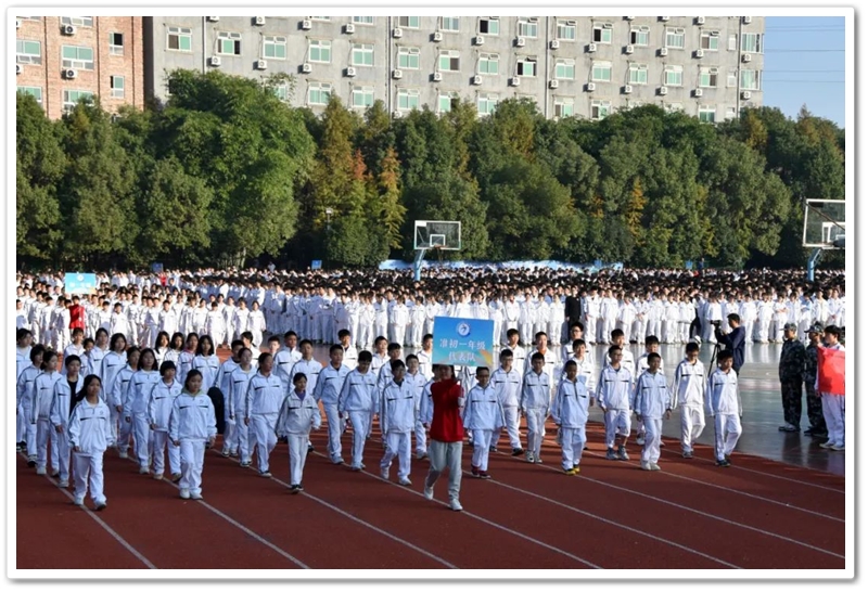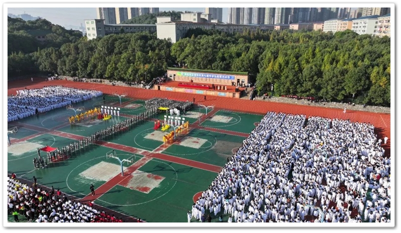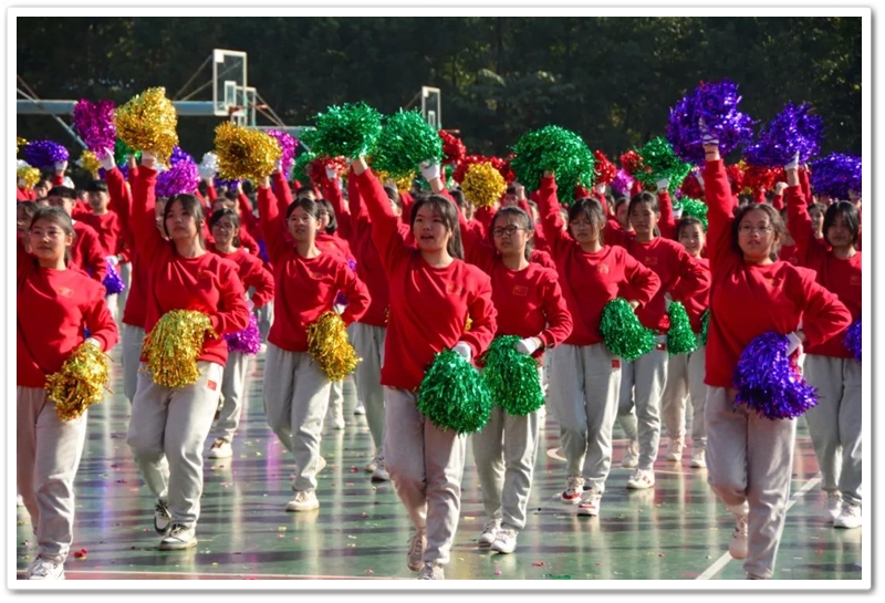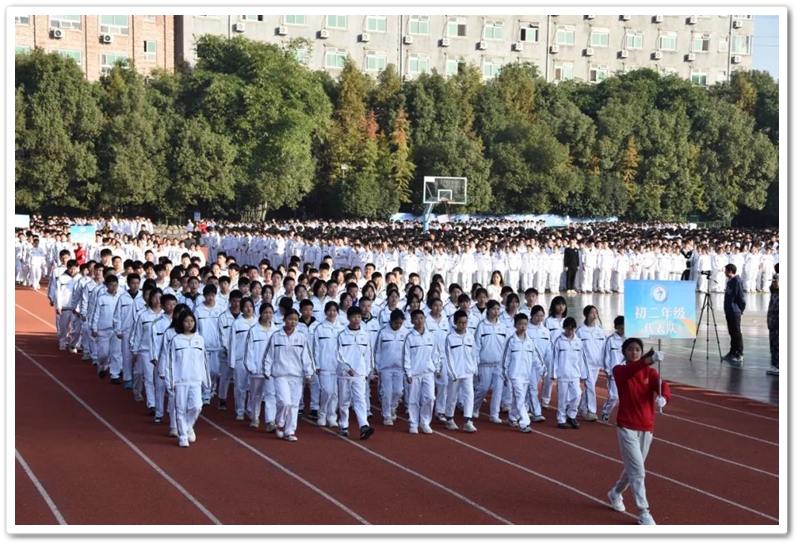 入场式完毕,主席台前南北两侧洁白的校服方阵、东向对面五彩缤纷的表演方阵将操场上的浩瀚画卷铺展得气势磅礴。高一学生构筑的迷彩旗杆基座端居正中央,国旗、校旗、金龙、憨狮、会徽、标语井然有序。