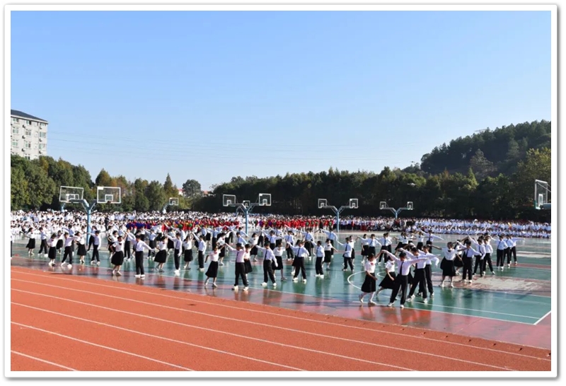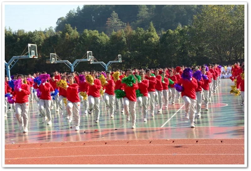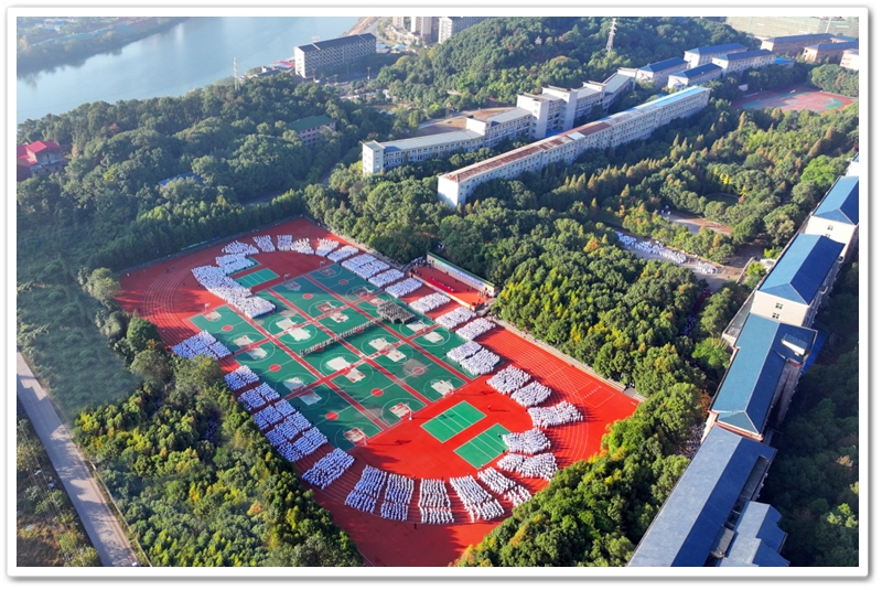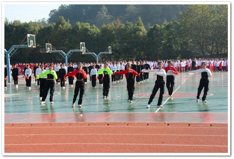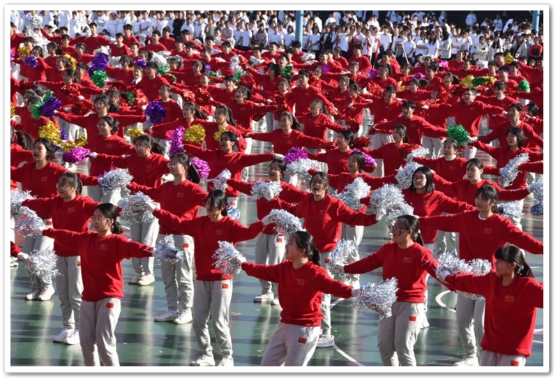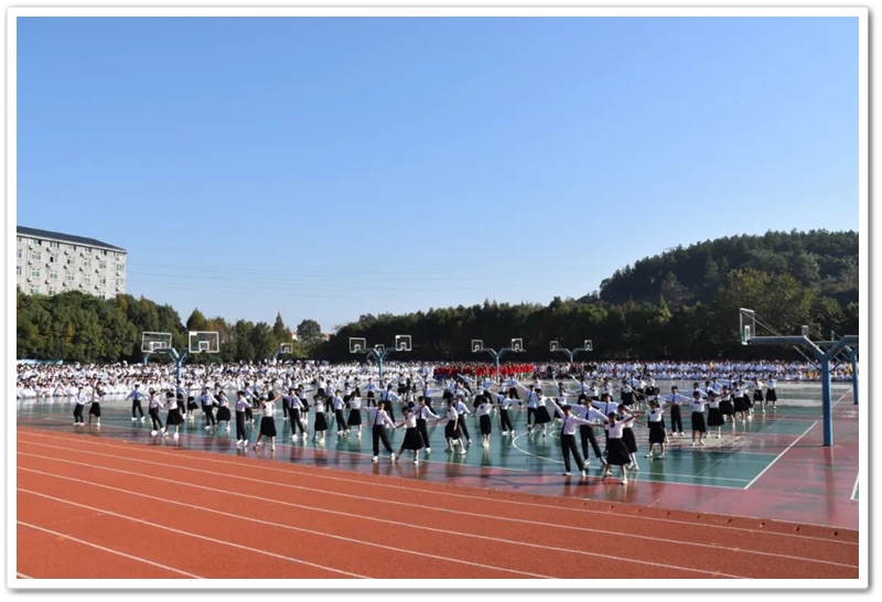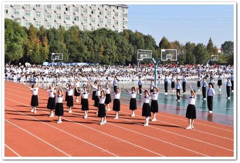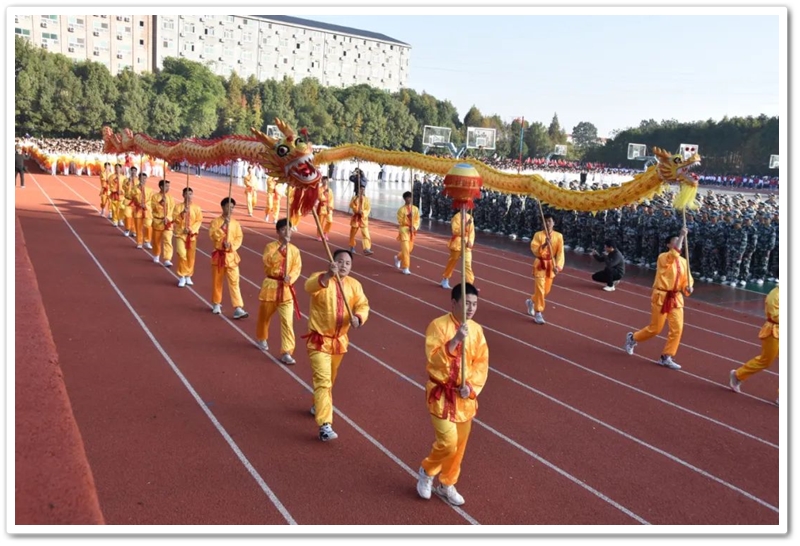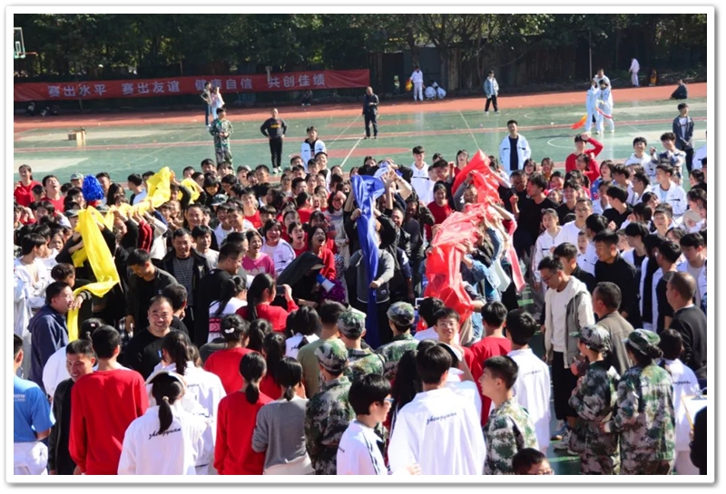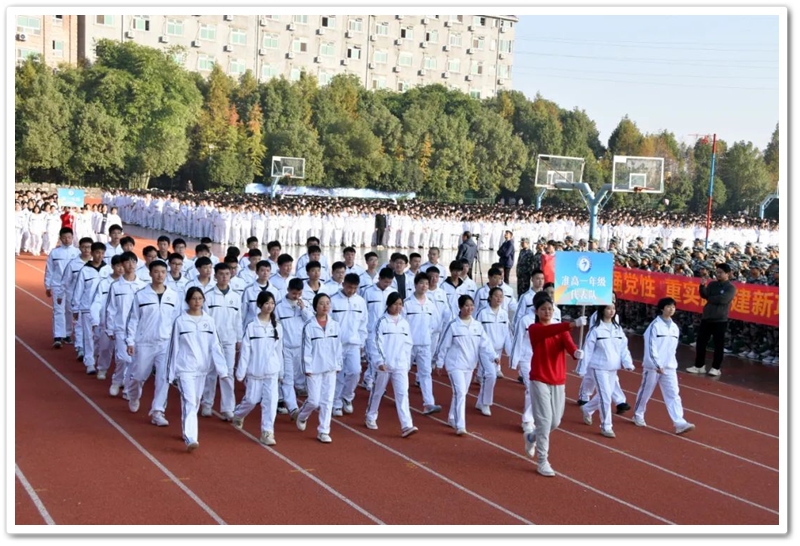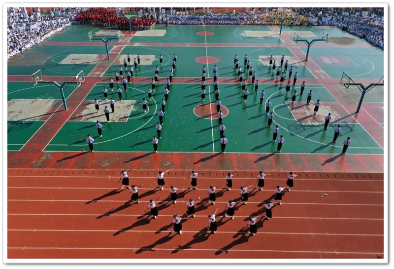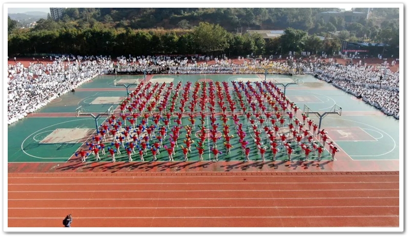 入场式完毕,主席台前南北两侧洁白的校服方阵、东向对面五彩缤纷的表演方阵将操场上的浩瀚画卷铺展得气势磅礴。高一学生构筑的迷彩旗杆基座端居正中央,国旗、校旗、金龙、憨狮、会徽、标语井然有序。