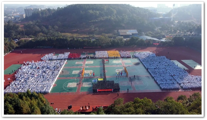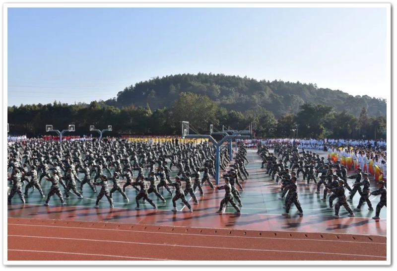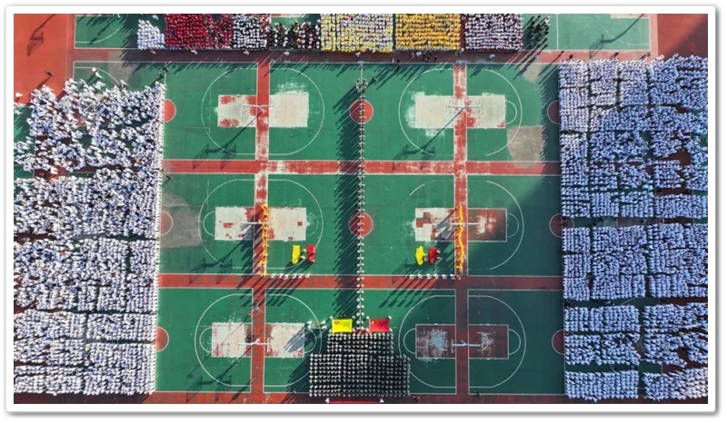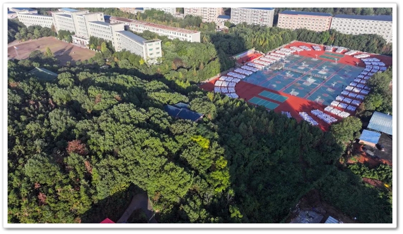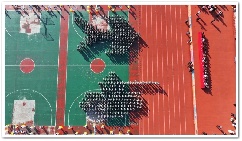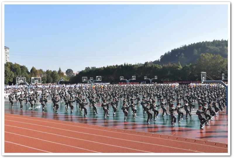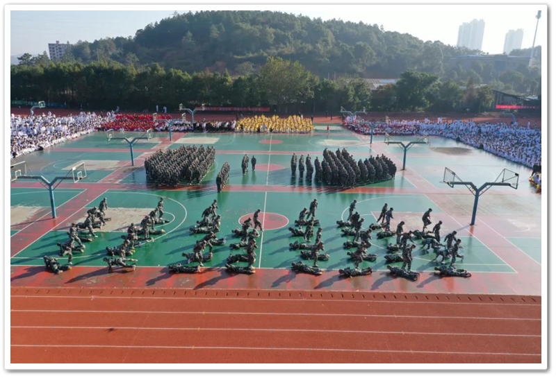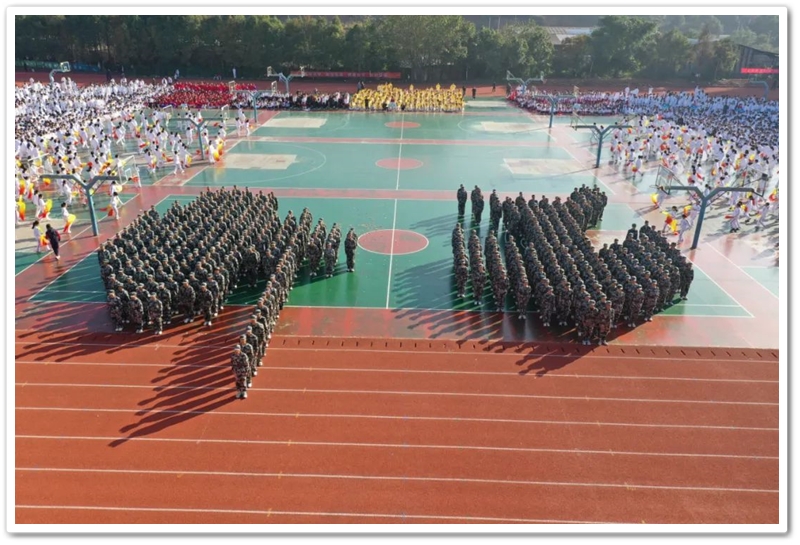 升旗仪式上构筑旗杆基座的迷彩少年均来自高一年级,他们在9月份军训当中的成长与历练得到市人武部及驻地部队领导的高度赞赏。耒阳市委常委、市人武部部长郭昔操寄语他们“涵养向上之志、凝聚团结之力、砥砺报国之能”。一套干脆利落、孔武有力的军体操表演过后,身着军训迷彩服的高一学子们迅速集结,顷刻间构筑出坦克和战斗机造型,带着“携笔从戎”的梦想,带着正源学子的精气神,于操场中央斗志昂扬驰骋前行。