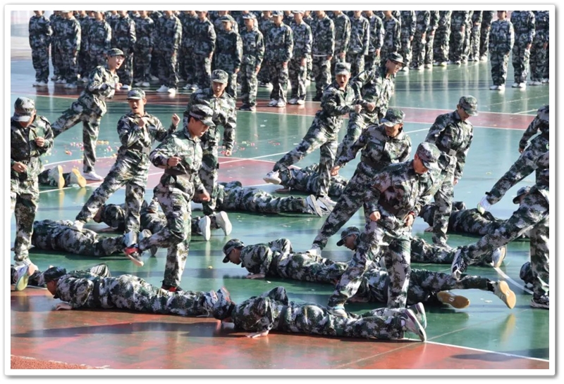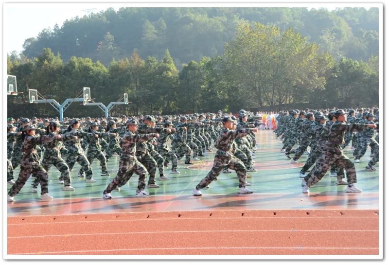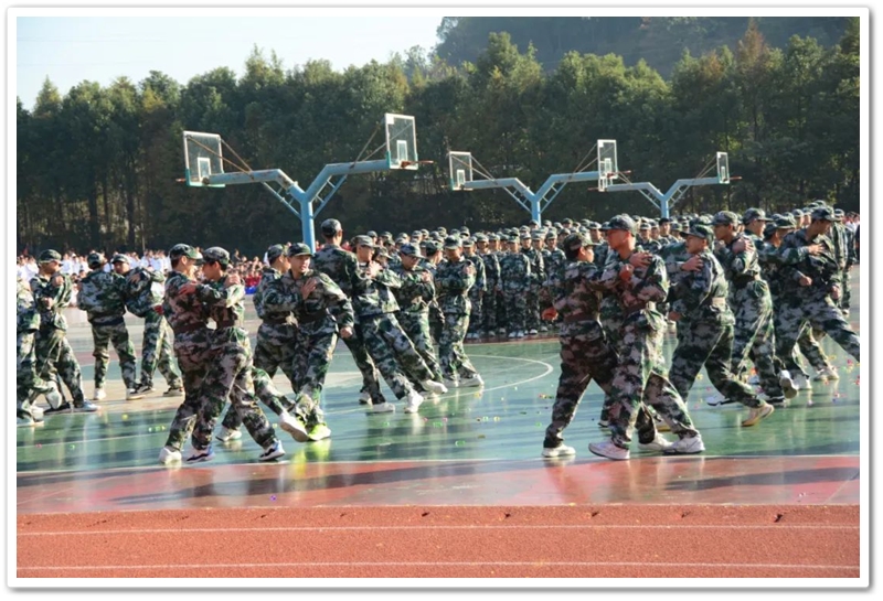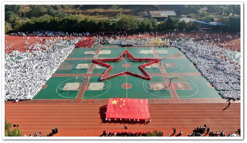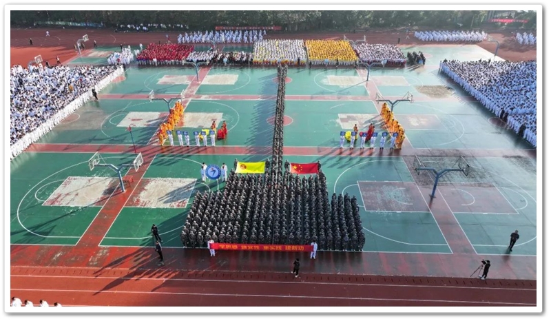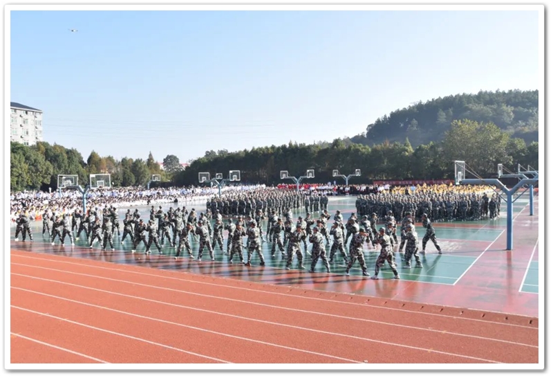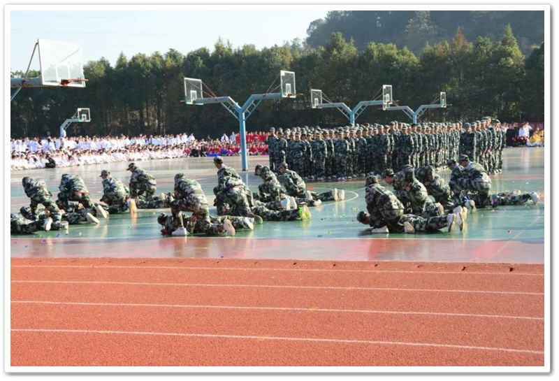 升旗仪式上构筑旗杆基座的迷彩少年均来自高一年级,他们在9月份军训当中的成长与历练得到市人武部及驻地部队领导的高度赞赏。耒阳市委常委、市人武部部长郭昔操寄语他们“涵养向上之志、凝聚团结之力、砥砺报国之能”。一套干脆利落、孔武有力的军体操表演过后,身着军训迷彩服的高一学子们迅速集结,顷刻间构筑出坦克和战斗机造型,带着“携笔从戎”的梦想,带着正源学子的精气神,于操场中央斗志昂扬驰骋前行。