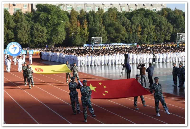 国旗护卫队、校旗方阵、运动会会徽方阵、标语方阵由北向南依次入场。