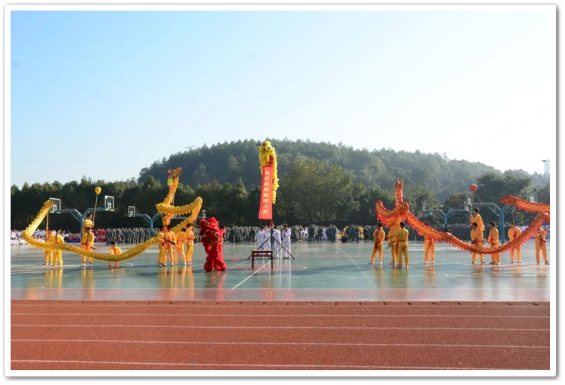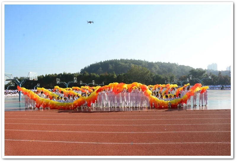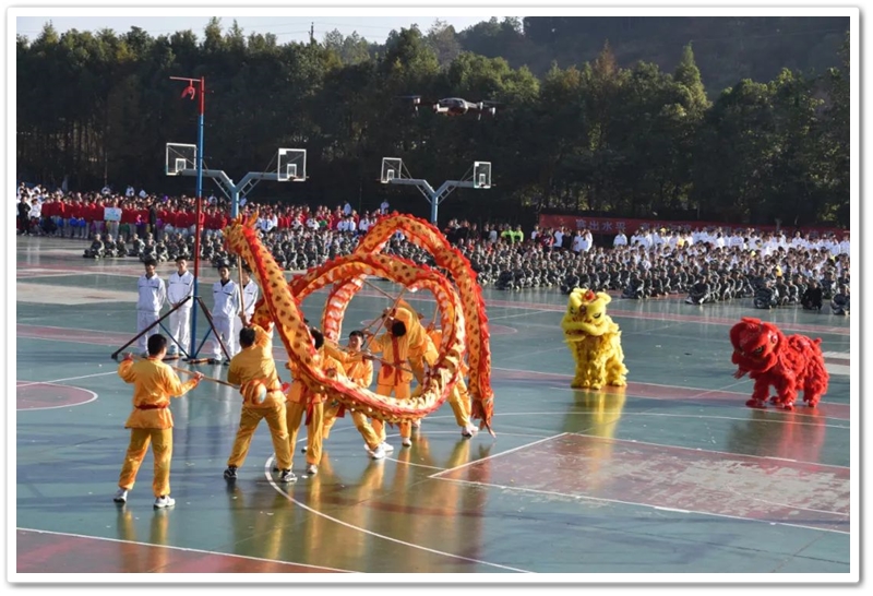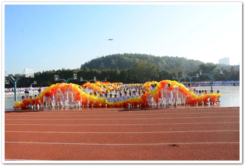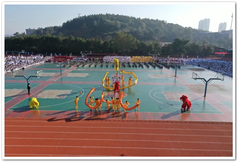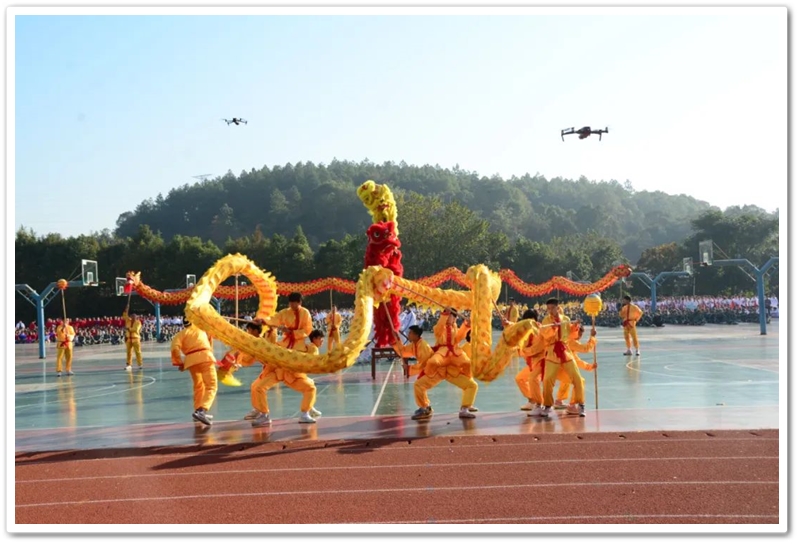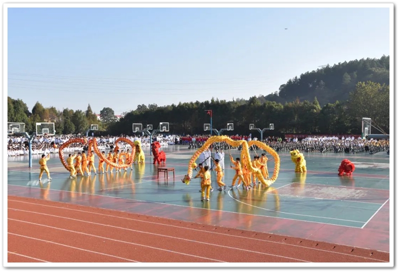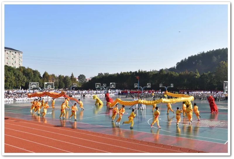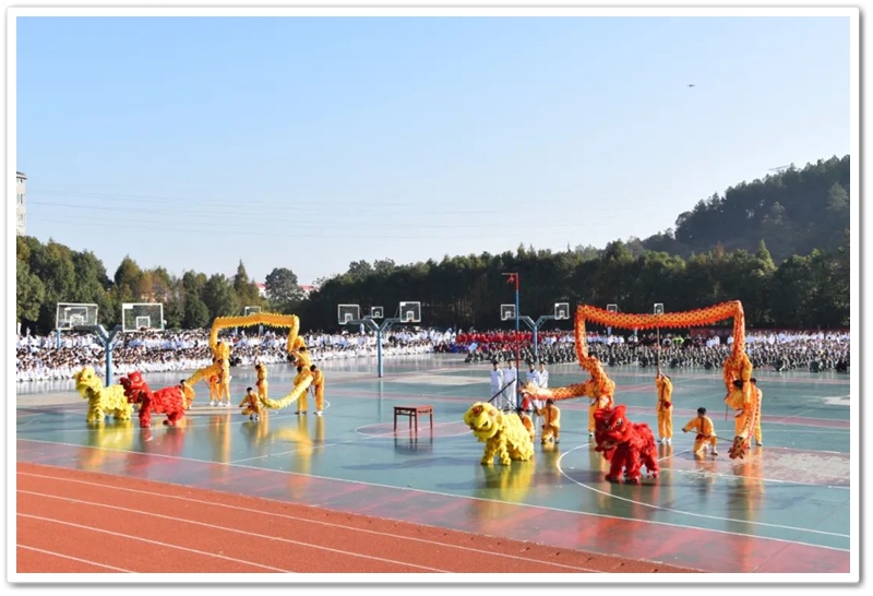 金龙飞舞、憨狮跃动,慷慨激昂的《男儿当志强》鼓点声中,正源龙狮闪亮登场。薪火相传的正源龙狮队,曾于2019年荣登湖南经视演播厅,被誉为“镇棚之宝”。上月刚刚举办的耒阳市中小学生运动会开幕式上,正源龙狮队又一次拔得头筹,大放异彩。今天的龙狮表演,4只憨狮、两条金龙再次大胆创新,在传统的盘金龙、划龙舟、跃龙门、憨狮献瑞、虎啸高山之外,又为全场师生亮出一式精彩绝伦的“百尺竿头勇当先”。他们于气氛最高潮处龙腾狮跃奋勇争高,于百尺竿头勇攀高峰绽放镌印正源精神“敢打敢拼敢为人先”的艳丽红绸,博得精妙头彩,赢得掌声雷鸣。