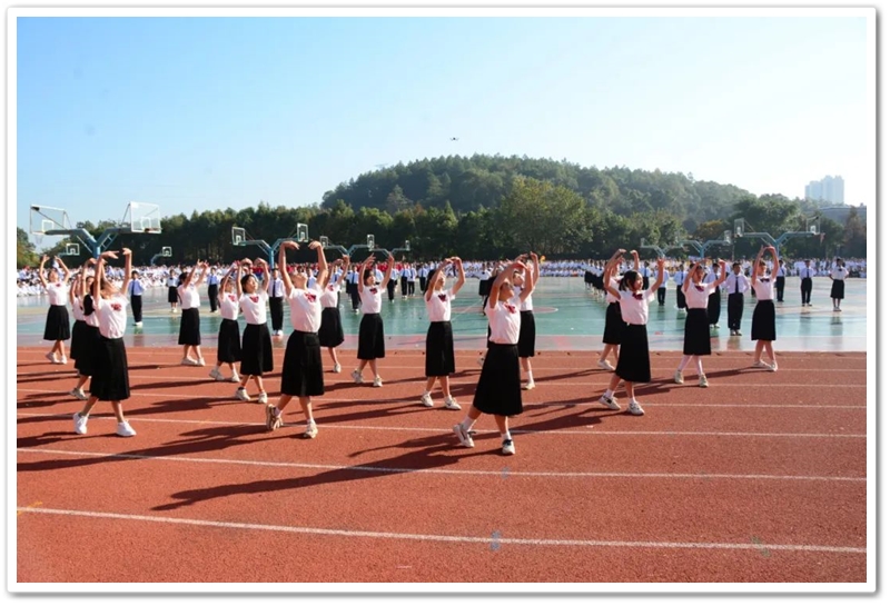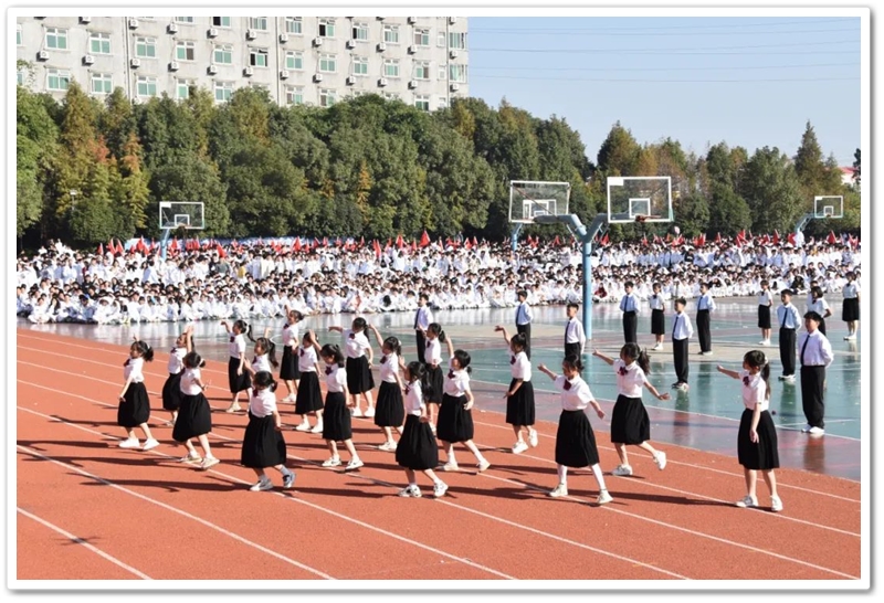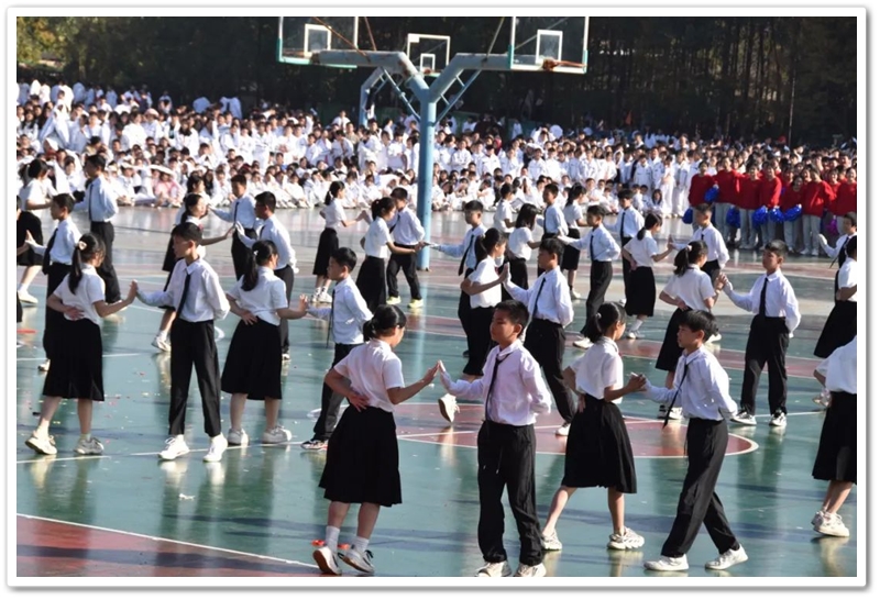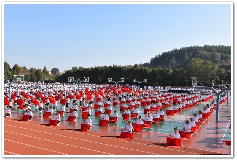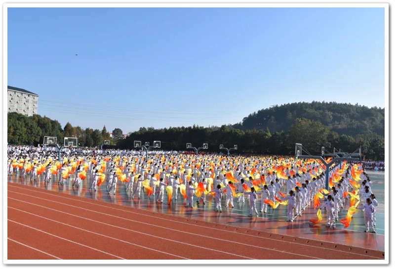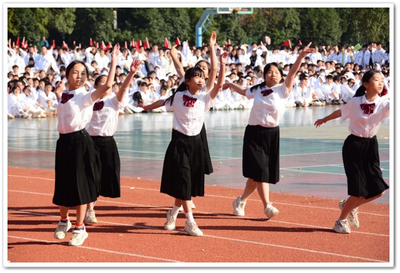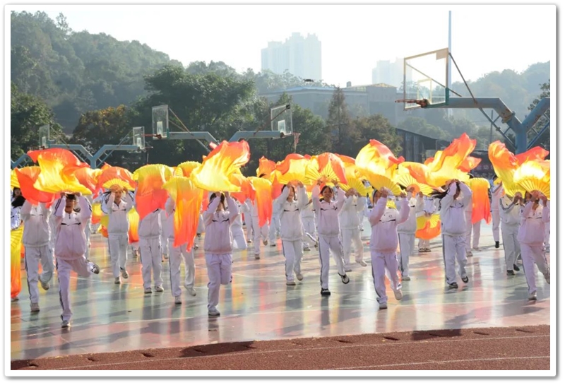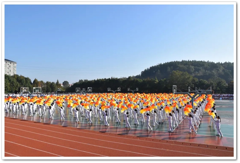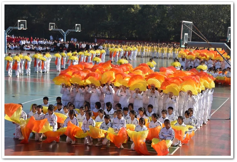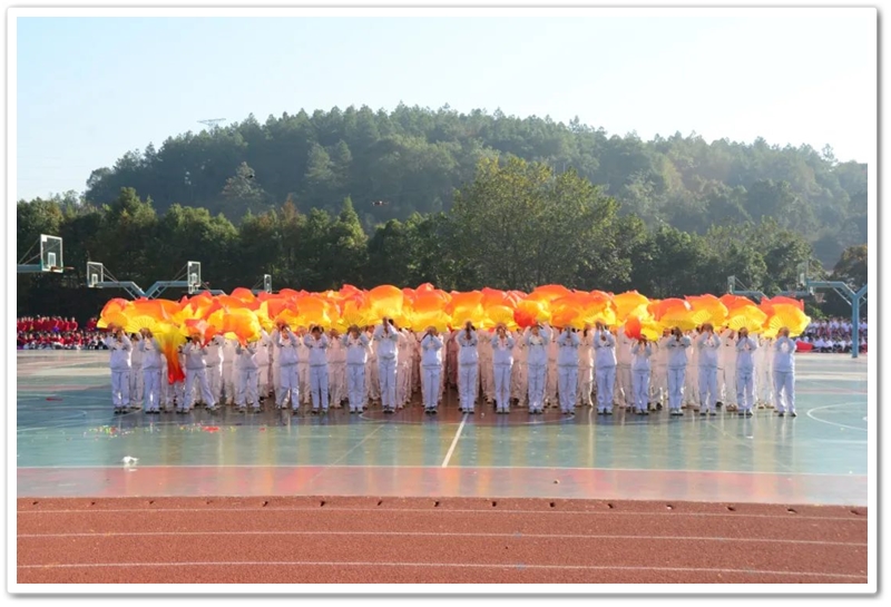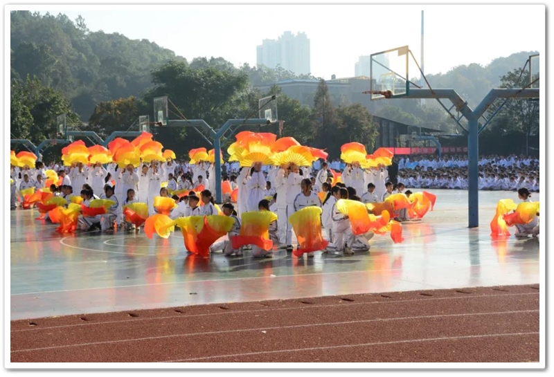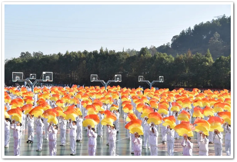长扇翩翩、锦绣朵朵,纯洁朴素的白校服映衬着橘红似火的彩扇,初一学子们鲜妍如花、缤纷灿烂,泼泼洒洒将整个操场大舞台渲染得繁花似锦。无论走到哪里,罗校长总是骄傲地说,正源的校服是最美的,正源的孩子是最可爱的。成百上千的初一少年们欢唱着《幸福中国一起走》,以一袭朴素的皎洁为底色,手中长扇时而化身澎湃浪潮,时而化身炫丽焰火,时而化身条条金龙……他们将正源孩子们的纯真与活力展现得淋漓尽致,展现出正源校园里最为靓丽的风景!