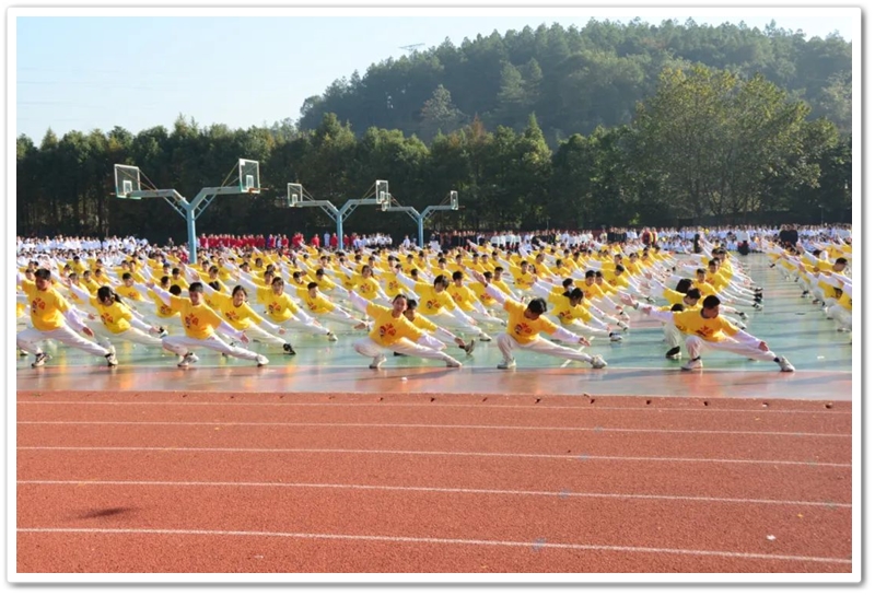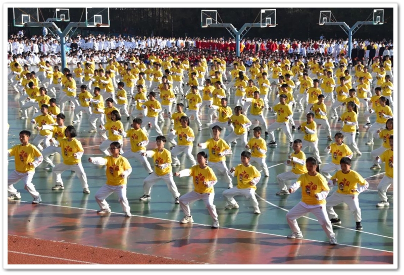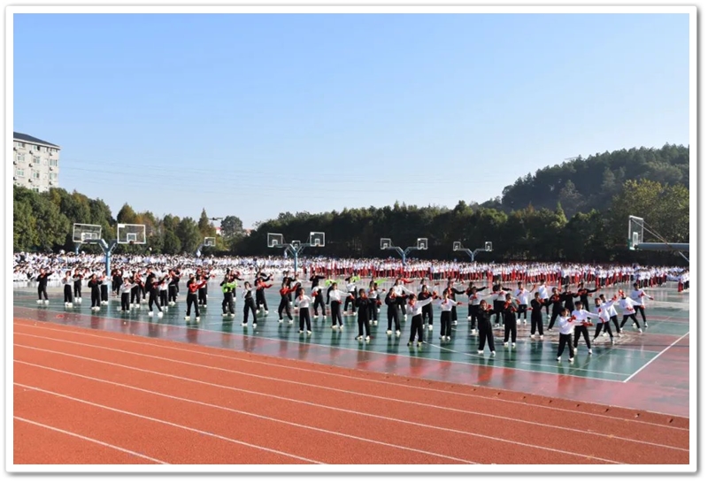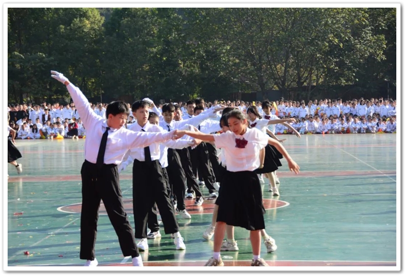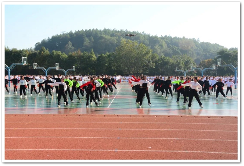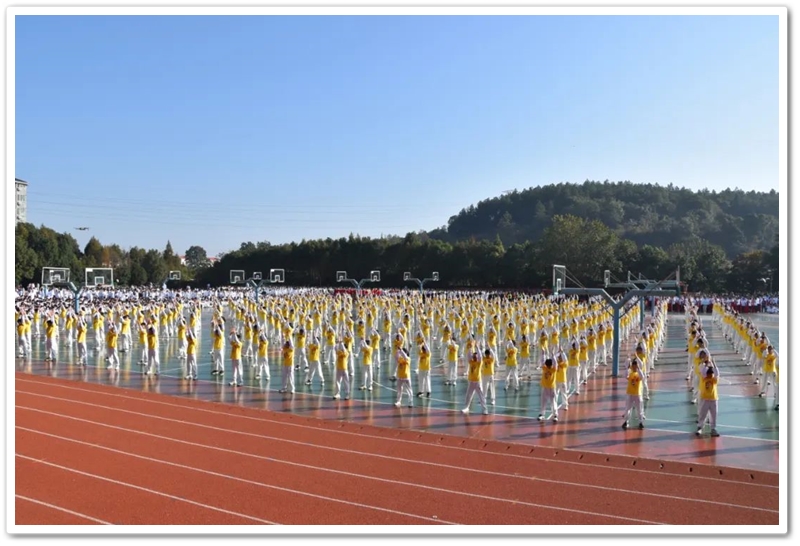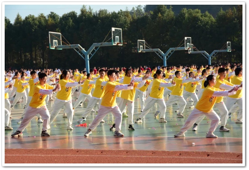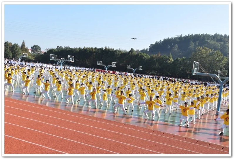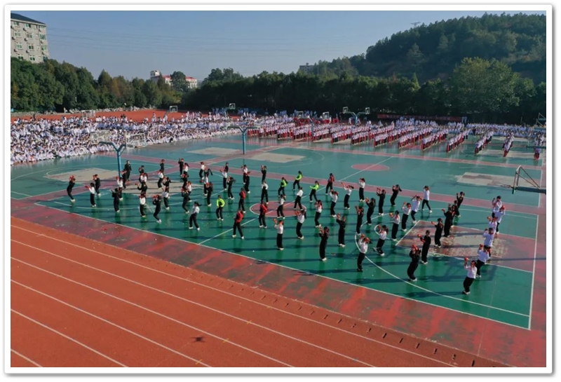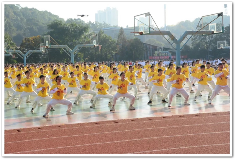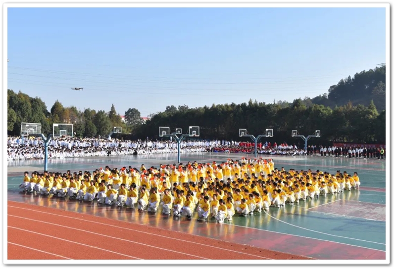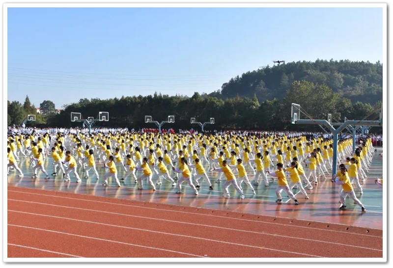 古香古色的古风歌曲当中,初二年级武术韵律操《天地龙鳞》铺开架势。冲拳、劈掌、弹腿、勾肘、下马步、推云手……一招一式有板有眼、行云流水,二百多人整齐划一、气势磅礴。