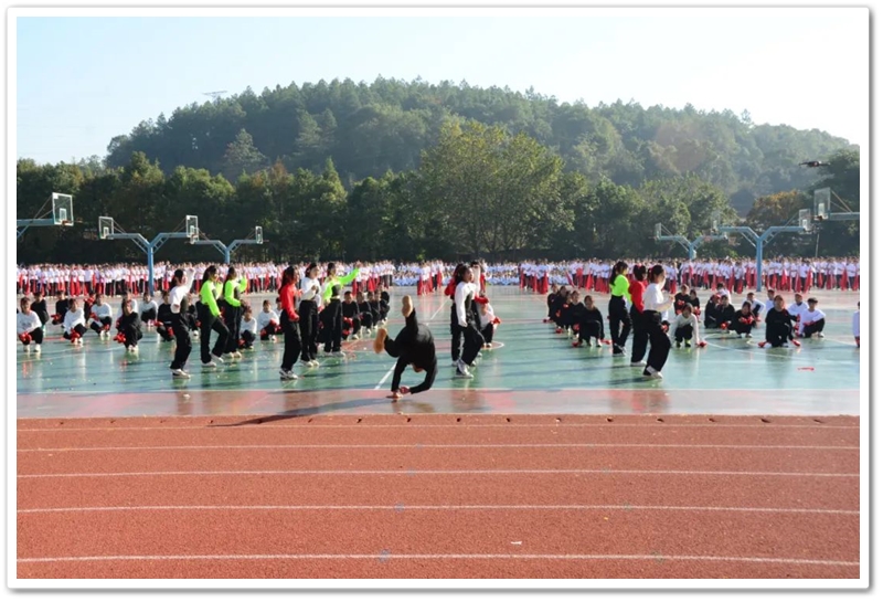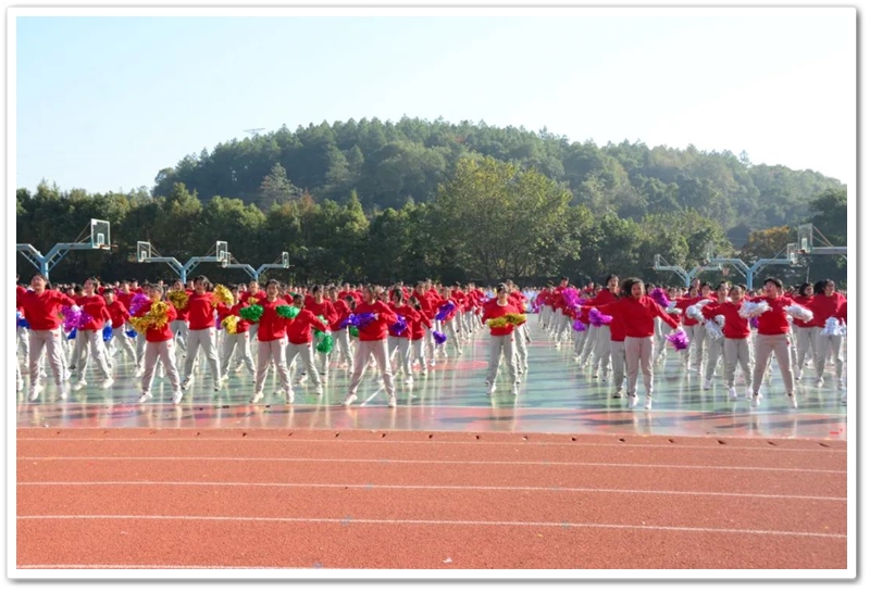 高二年级健身操舞蹈《踩踩踩》上场之时,操场中央正好旭日当空艳阳高照,明亮的阳光将缤纷的彩球照耀得光彩夺目,动感的节拍将同学们欢快的笑靥激扬得眉飞色舞。