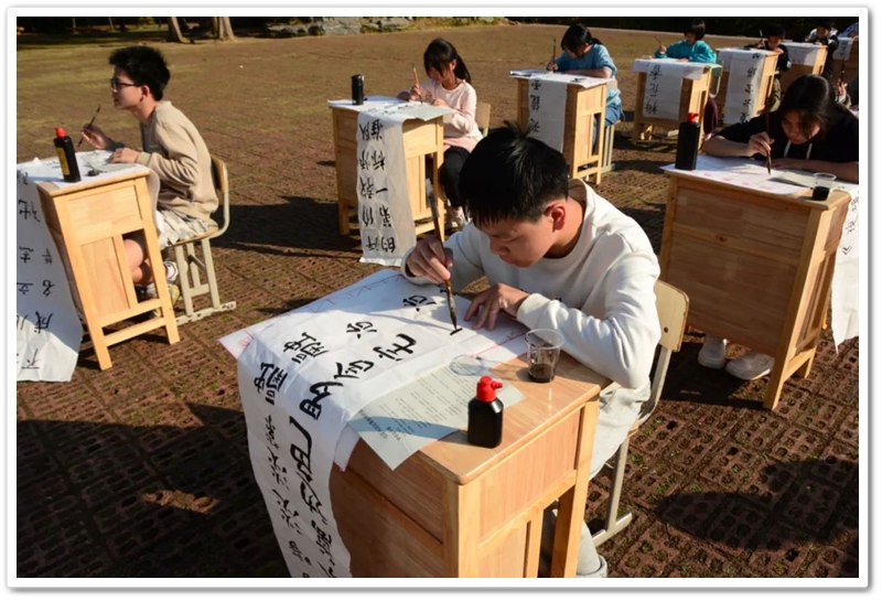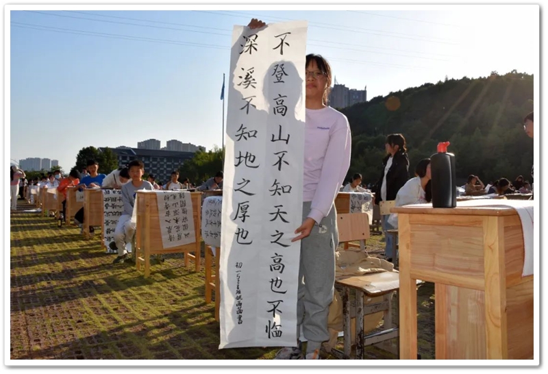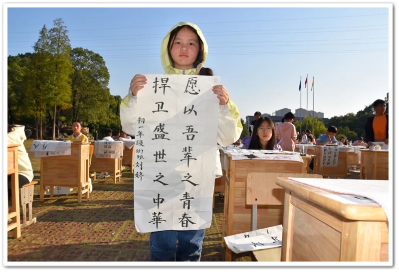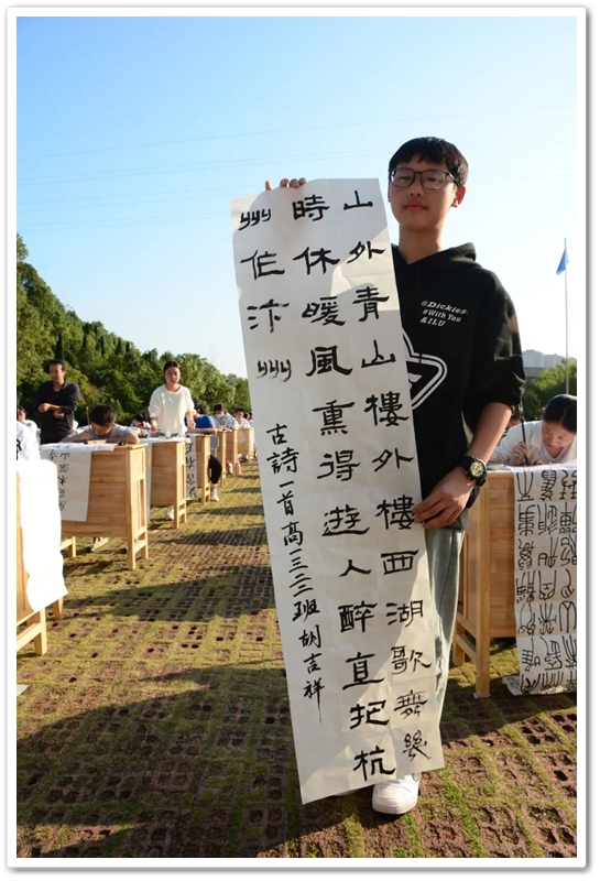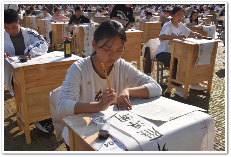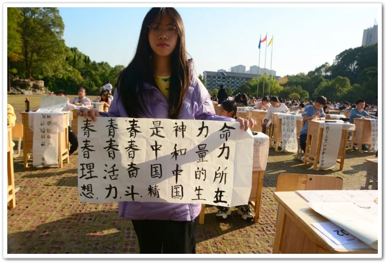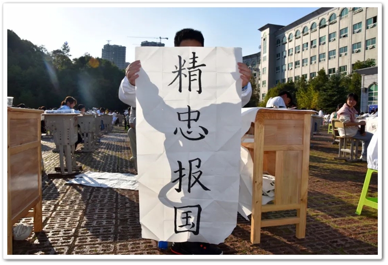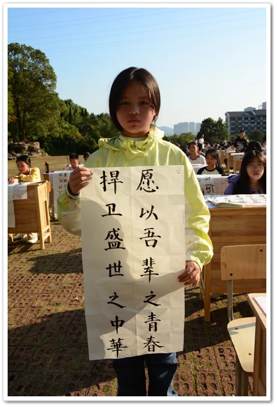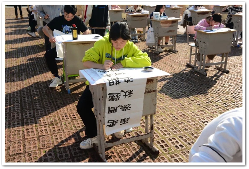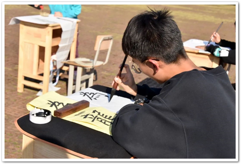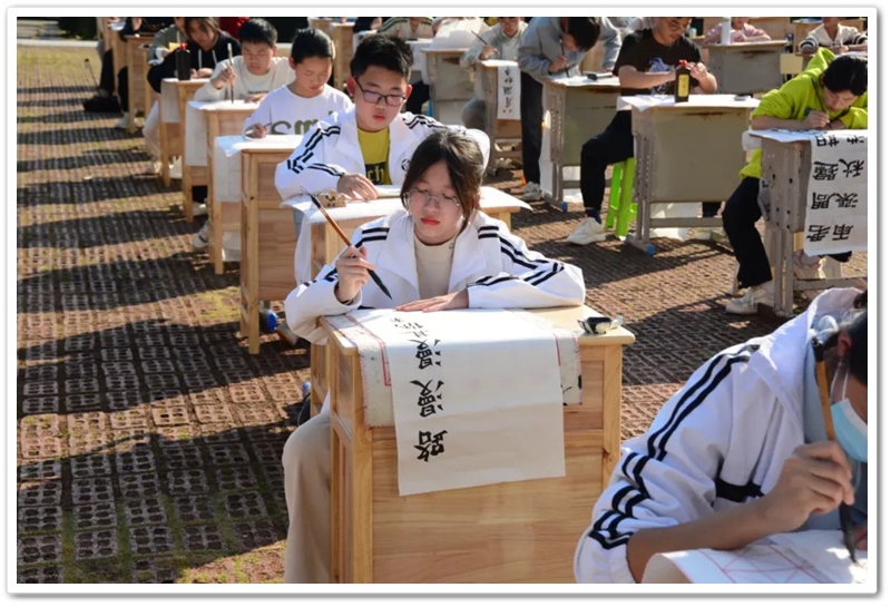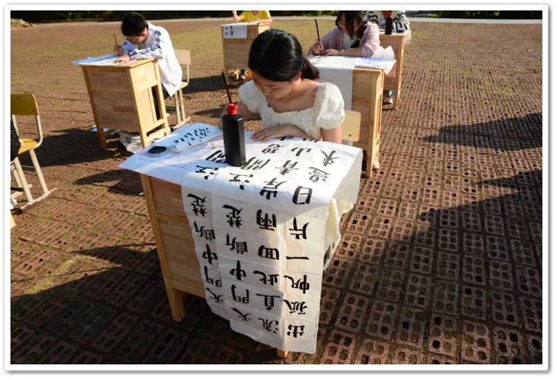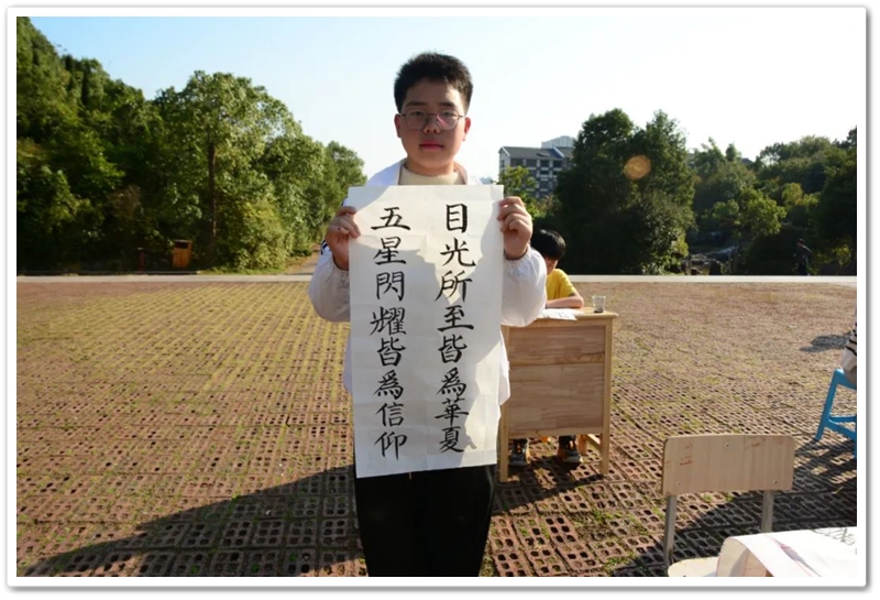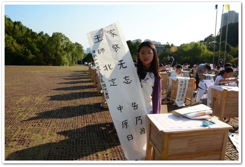 煦日高照,红旗飘飘,广场中,书桌前,同学们屏气凝神笔走游龙。