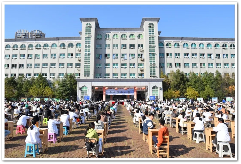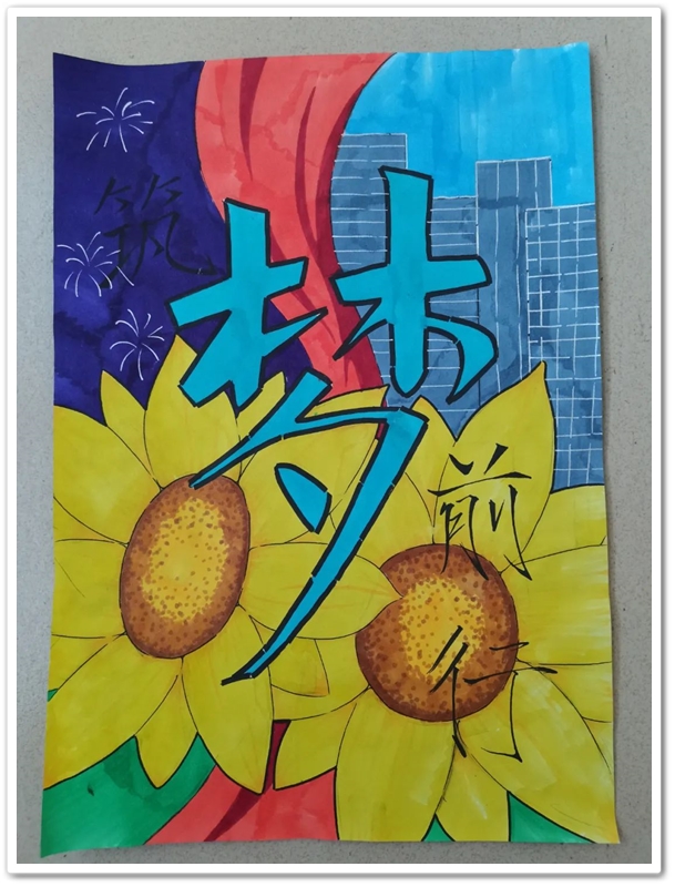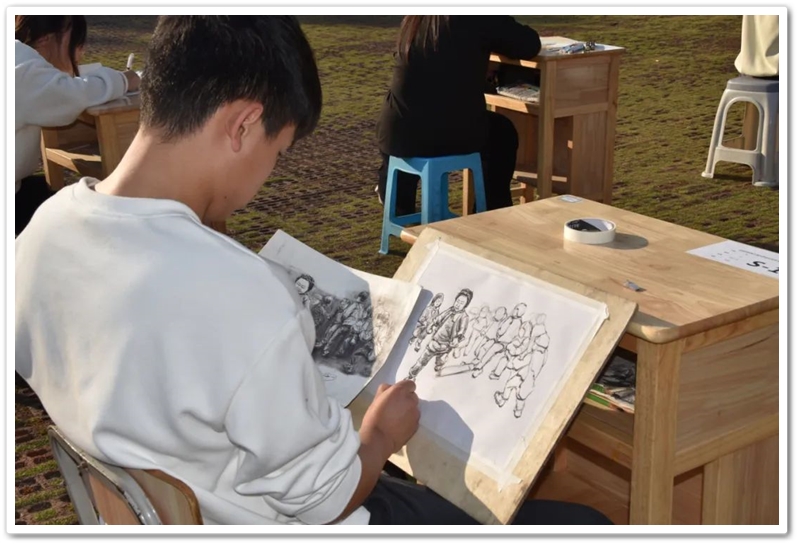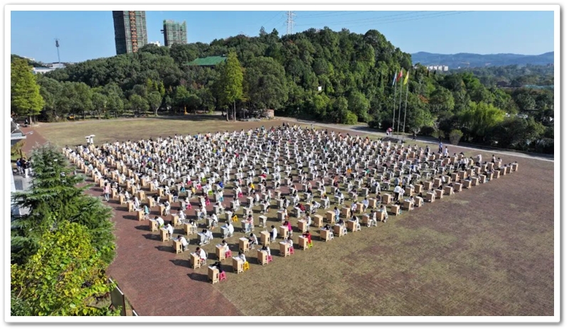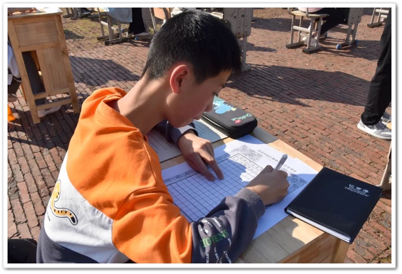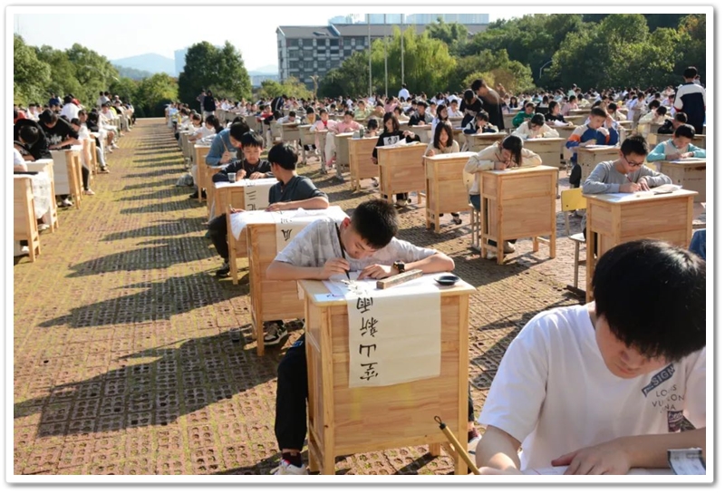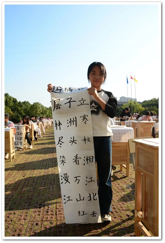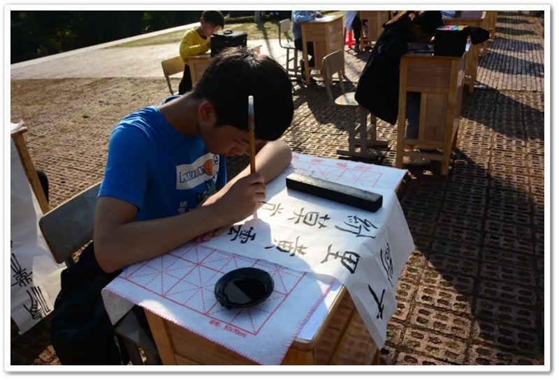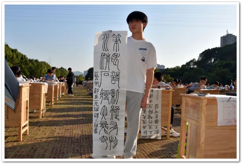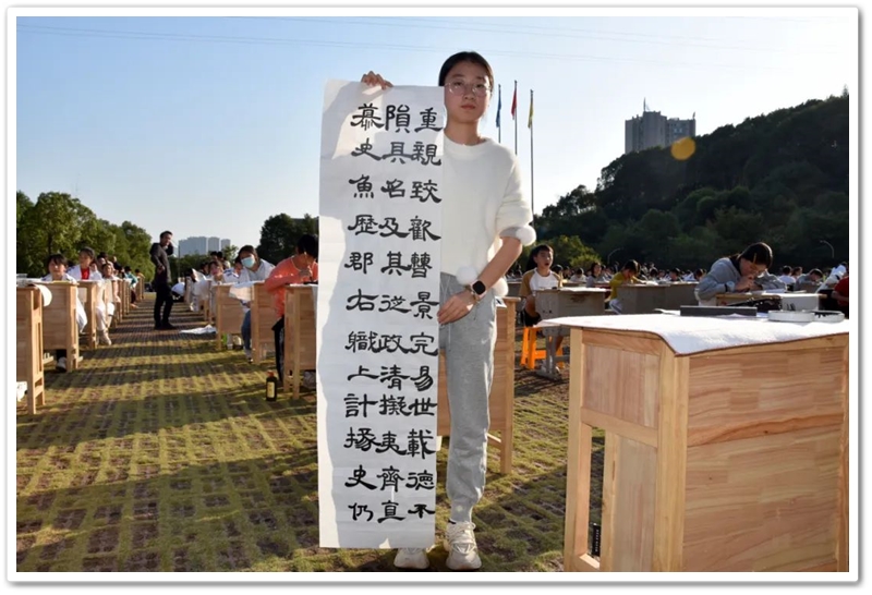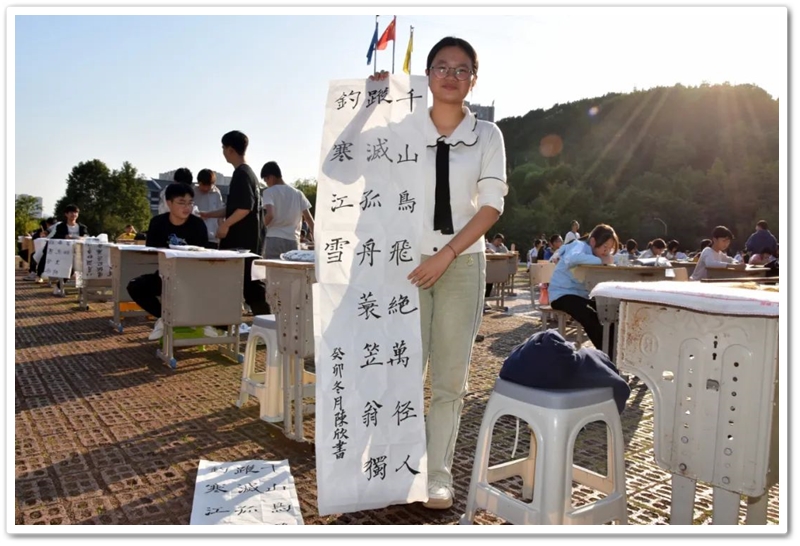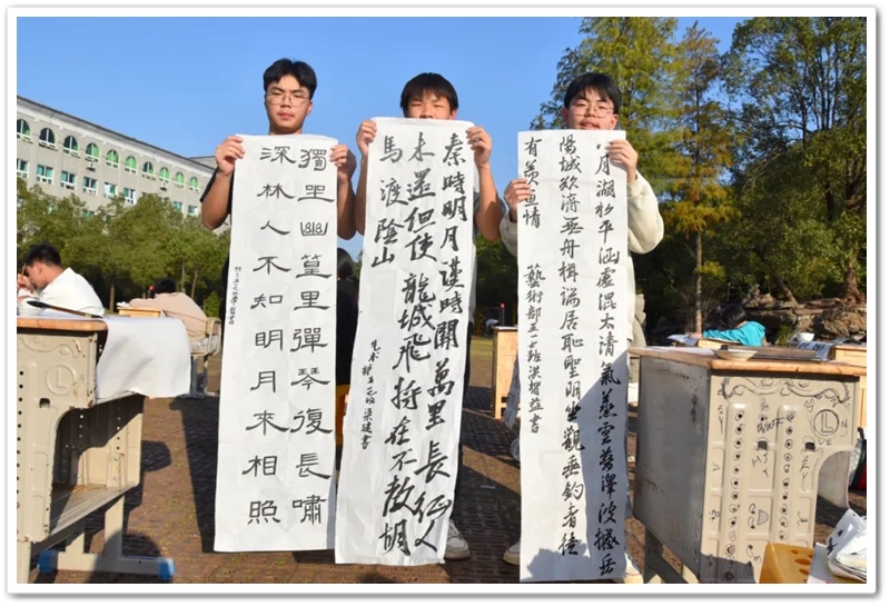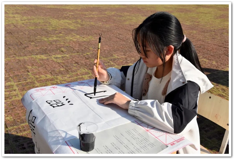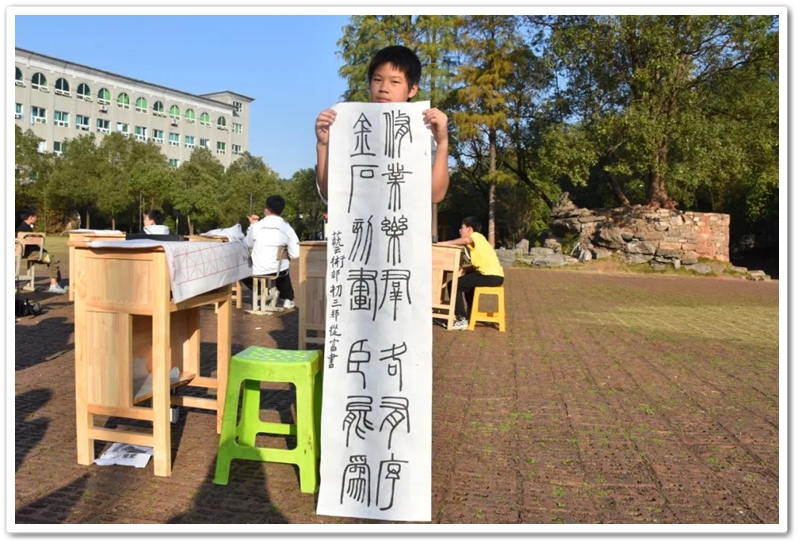 煦日高照,红旗飘飘,广场中,书桌前,同学们屏气凝神笔走游龙。