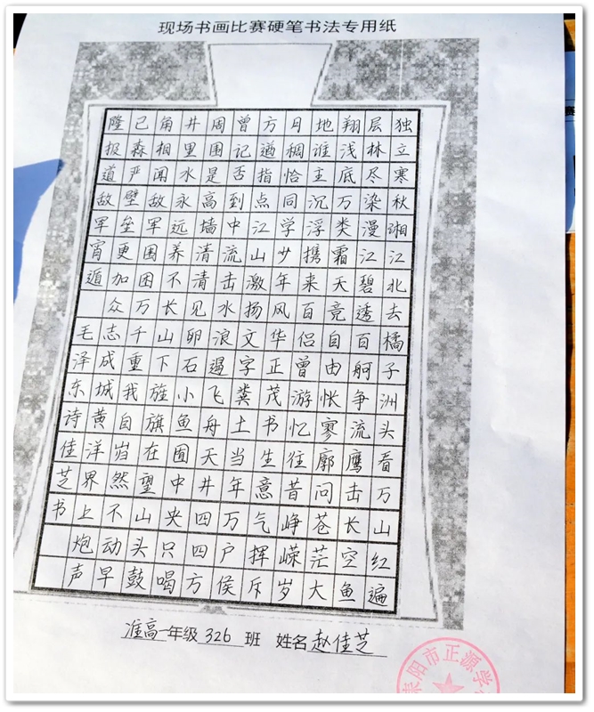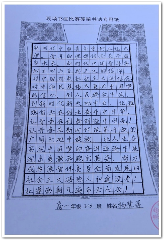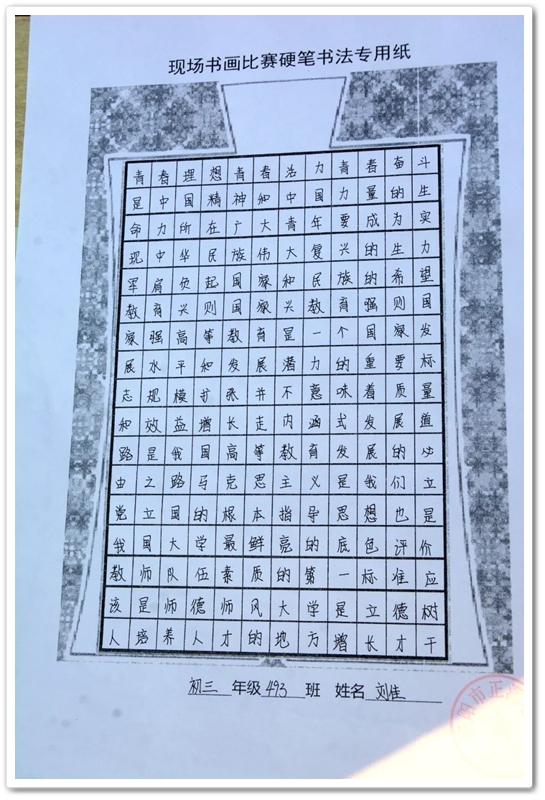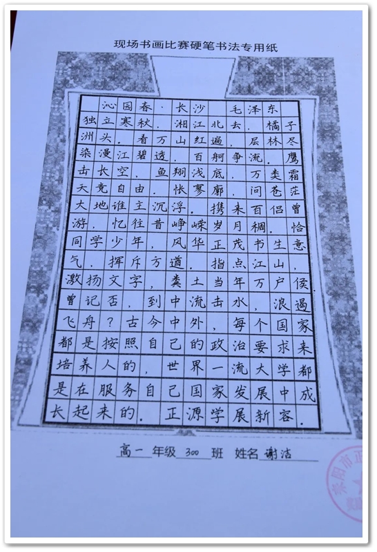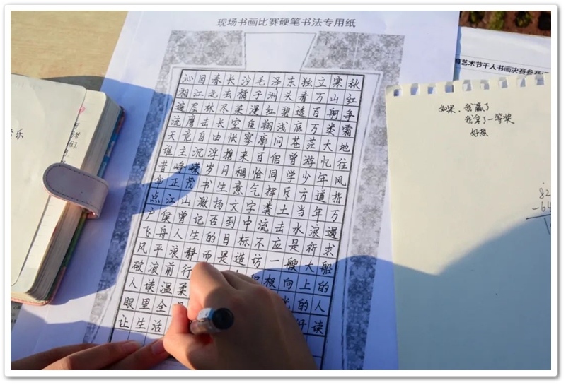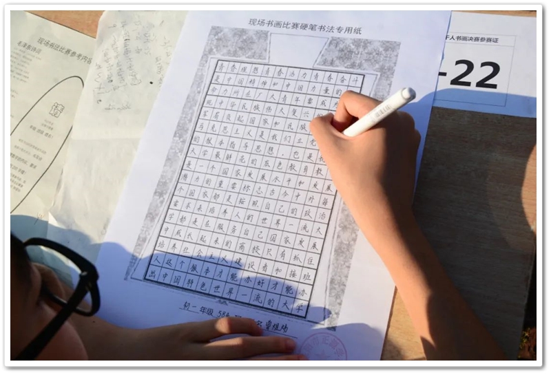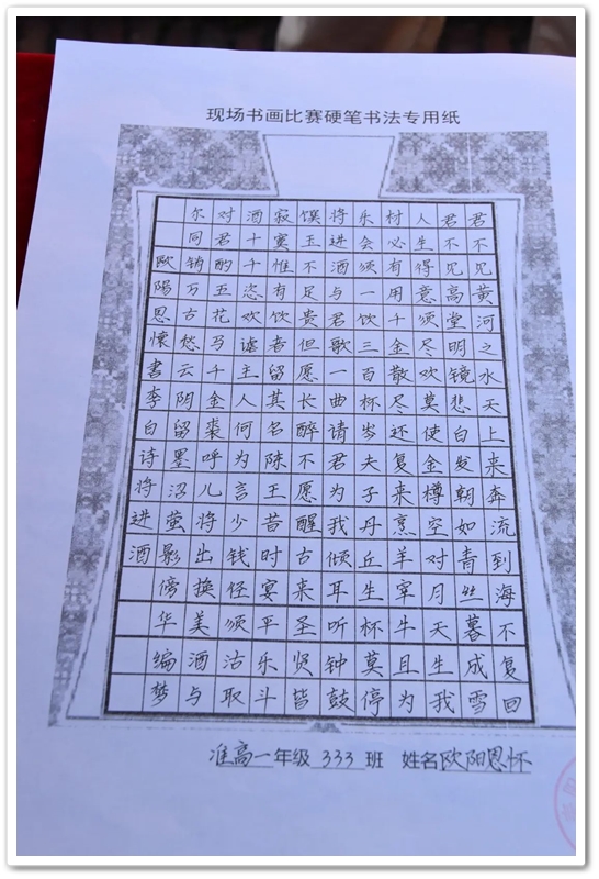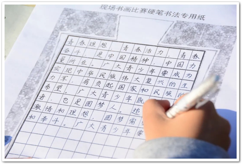 硬笔书法赛区里,毛泽东诗词、习近平金句及同学们自备的爱党爱国文段素材凝聚笔尖,力透纸背,沙沙有声。