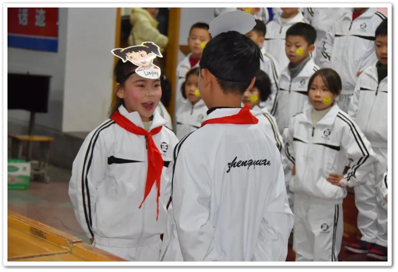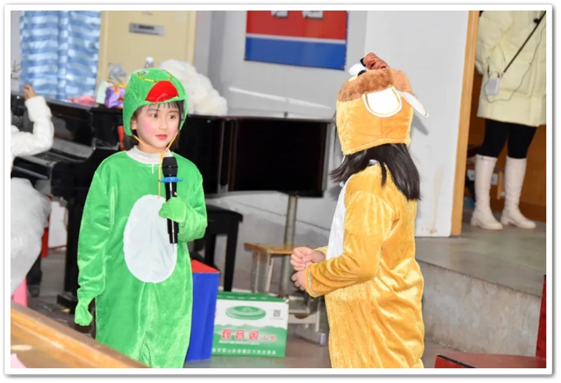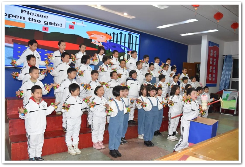 首先出场的是442班,学生们精彩演绎了在路上捡到书包的真实场景,流利整齐背诵了《Oh! A schoolbag》,紧接着一首《Head, shoulder, knees and toes》嗨翻全场,学生们整齐划一的动作,灵敏的反应让人惊讶不已。神秘欢快的出场音乐,让现场的小观众对于紧掩的小箱子好奇不已。445班精心筹备的《Please,open the gate!》, 将整个故事的趣味呈现,满足了大家的好奇心,标准的语音语调展示出学生们良好的英语口语水平。一首《Hello song》更是展示了二年级五班学生的热情友好。