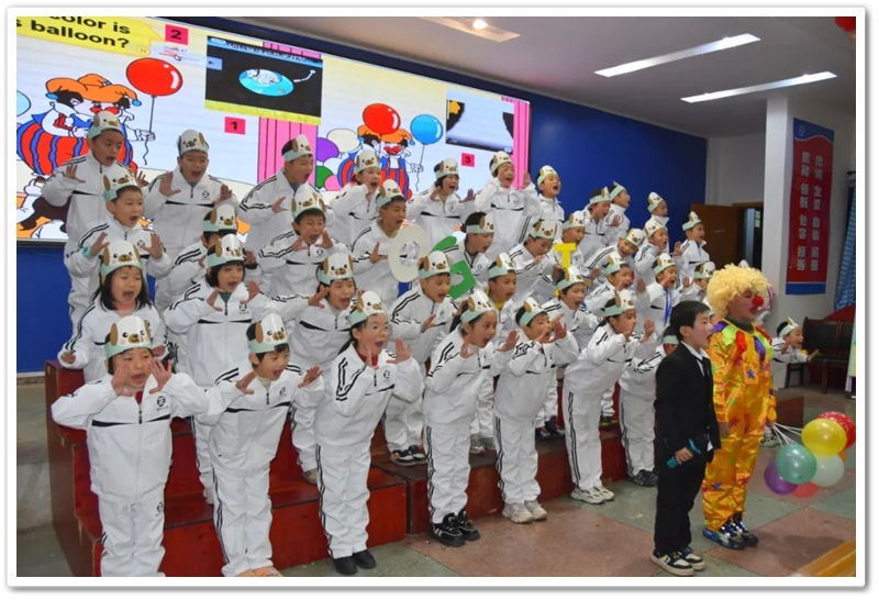 欢乐的音乐随之响起。快看,一个可爱的小丑带着他五彩斑斓的气球蹦蹦跳跳走向了现场观众,也将快乐带给了大家。443班整齐灵动的背诵了《What colour is this balloon?》,自信展示了他们对于英语颜色单词的良好掌握。虽然和一年级同唱了一首《Bingo》,却演绎了不一样的风格,生动活泼的演出了一只只灵动可爱的小狗BINGO,引起人的无限怜惜。即使自然界中存在弱肉强食的残酷现实,在446班孩子眼中也有一份美好童真,在英语绘本故事《I am hungry》一文中,尽管各种动物迫于生计去追逐其他弱小的生物,但是在追逐的过程中,我们却发现了孩子内心的柔软。随即446班学生在甜美的歌曲《Skidamarink》中唱到“Skidamarink a dink a dink,Skidamarink a doo ,I love you~”,萌化了现场不少观众,相信收到446班孩子的爱心表白他们一定会开心不已。