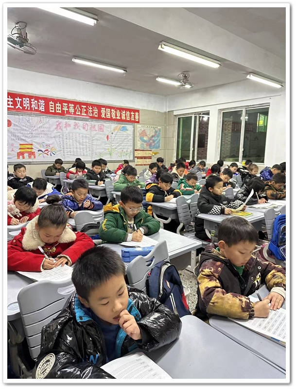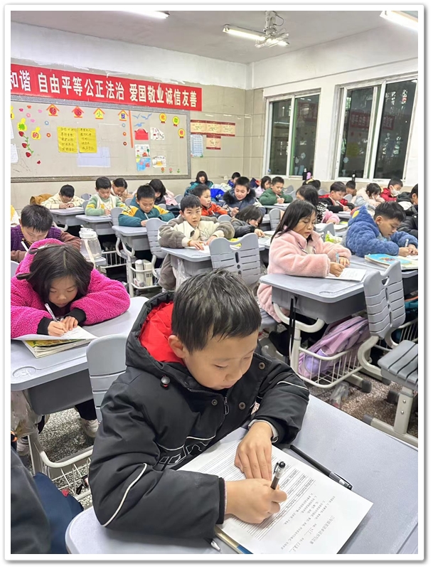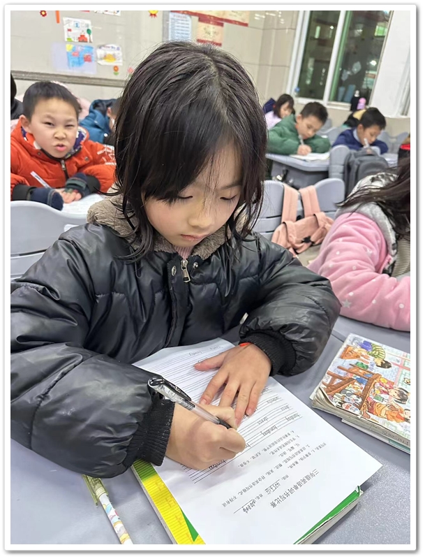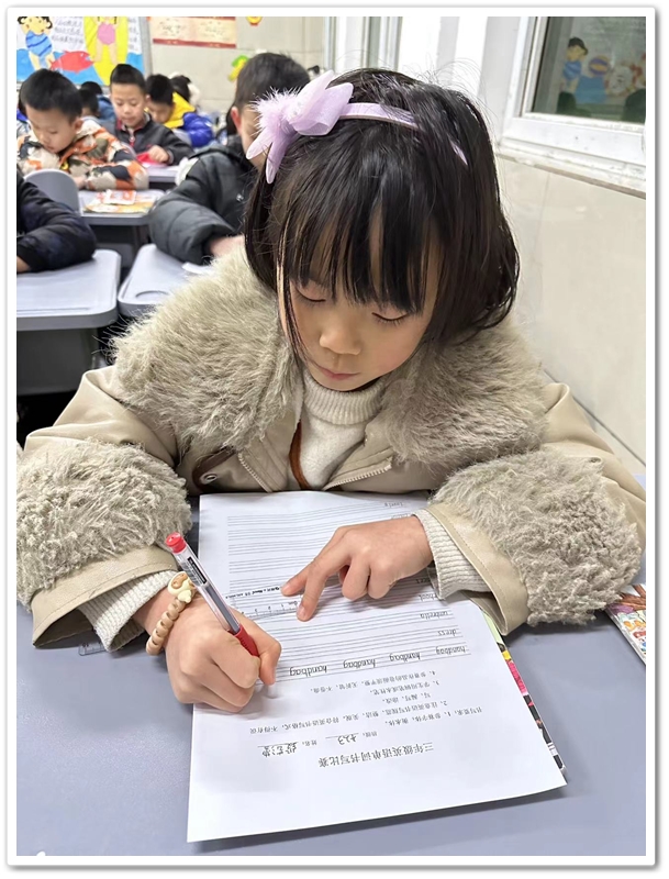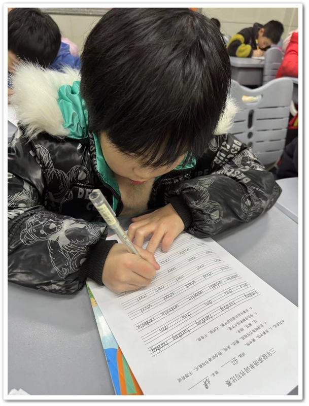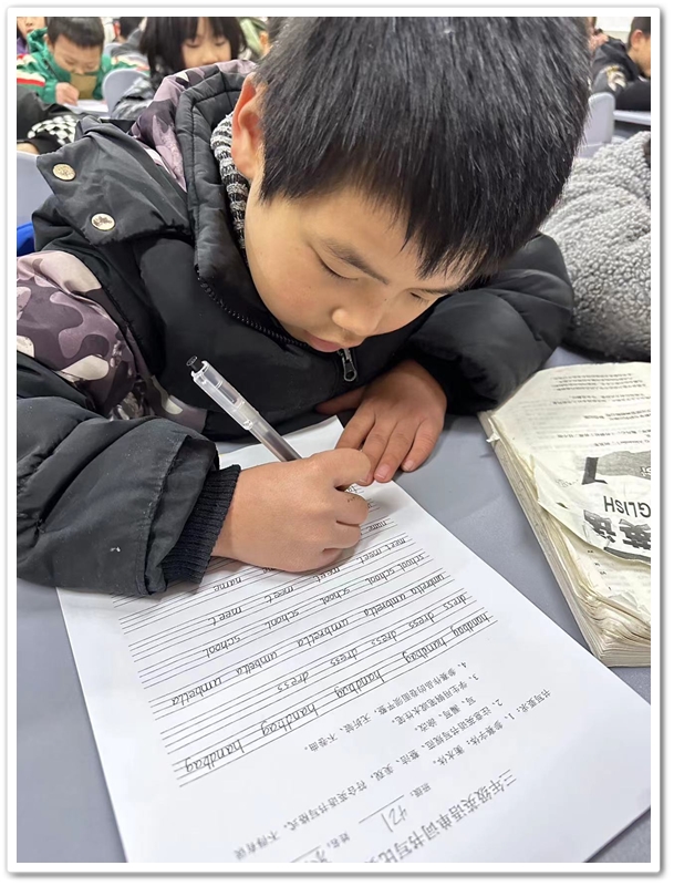 你瞧,孩子们坐姿端正,屏气凝神,挥洒笔墨,认真对待笔尖下的一笔一划,一个个优美的字母从他们的笔尖流淌,灵动地呈现在四线三格上,字母书写标准,字迹流畅端正,卷面整洁漂亮。同学们全神贯注、身姿挺拔地认真书写,他们时而奋笔疾书,时而低头沉思,无不想将最好的作品交到老师手中。