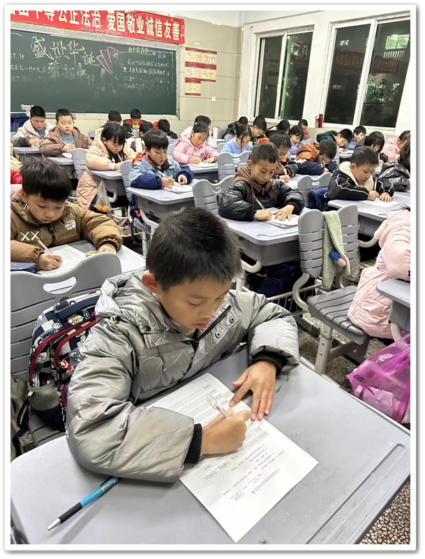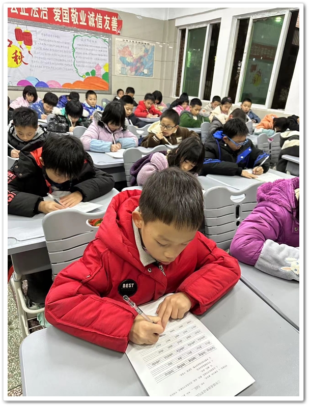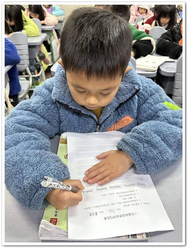 比赛开始后,参赛的同学们都迅速进入状态,专注于每个字母的书写,沉浸在英语单词的世界里。在“头正、肩平、身直、足安”的规范指导下,孩子们挺直腰背,端正坐姿,开始比赛。