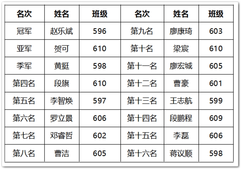 经过六个晚上的激烈对战,最终冠军属于596班的赵乐斌同学,他以出色的棋艺和冷静的思考能力战胜了来自其他班级的强劲对手,赢得了大家的赞赏和喝彩。亚军被610班贺可同学夺得,他的出色表现给观众们留下了深刻的印象。季军被598班黄挺同学夺得,他的才华和勇气让人们刮目相看。同时,还有十三名选手获得了优胜奖,他们在比赛中表现出色,展现了自己的实力和潜力。