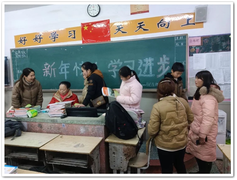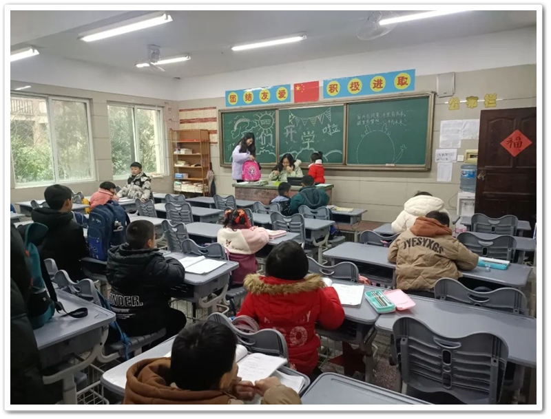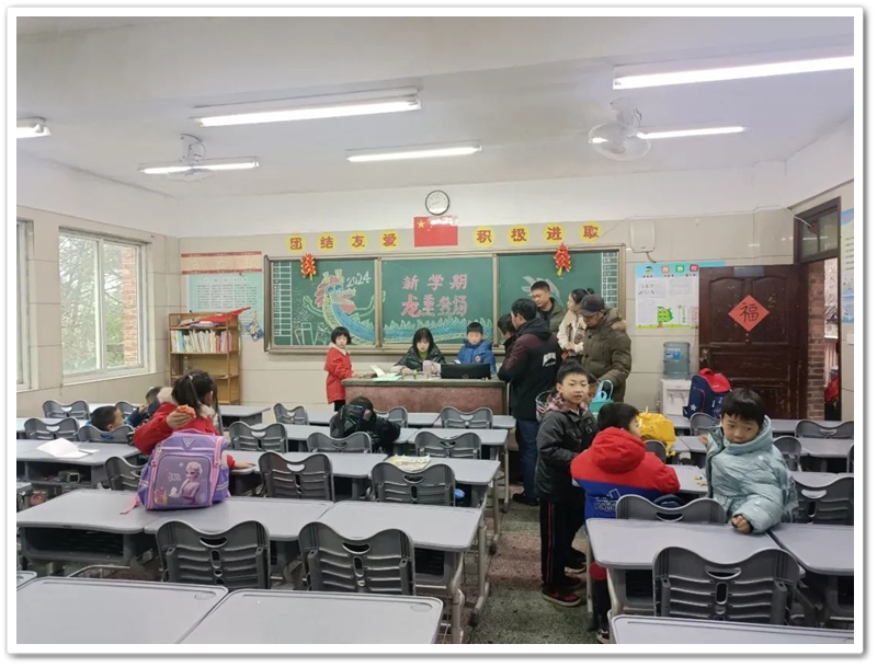 上午是小学进校。老师们已提前几天落实好各项开学准备工作,教室里桌椅整洁窗明几净,黑板上迎新祝福板书五彩缤纷。早起的鸟儿有虫吃。最早进教室报到的几名小同学,当仁不让地被老师抓了“壮丁”,担任起老师的小助手。开学第一天就成了老师的左膀右臂,孩子们蹦蹦跳跳跑前跑后,招呼着一个个陆续到来的同学,收报到册,收寒假作业,指引同学和家长们签阅安全提示书……一个个兴致勃勃。