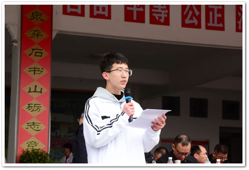 经久不息的掌声过后,进入激动人心的高三誓师环节。高三学生代表向瑭、高三教师代表张建文、高三年级主任资忠分别致辞。